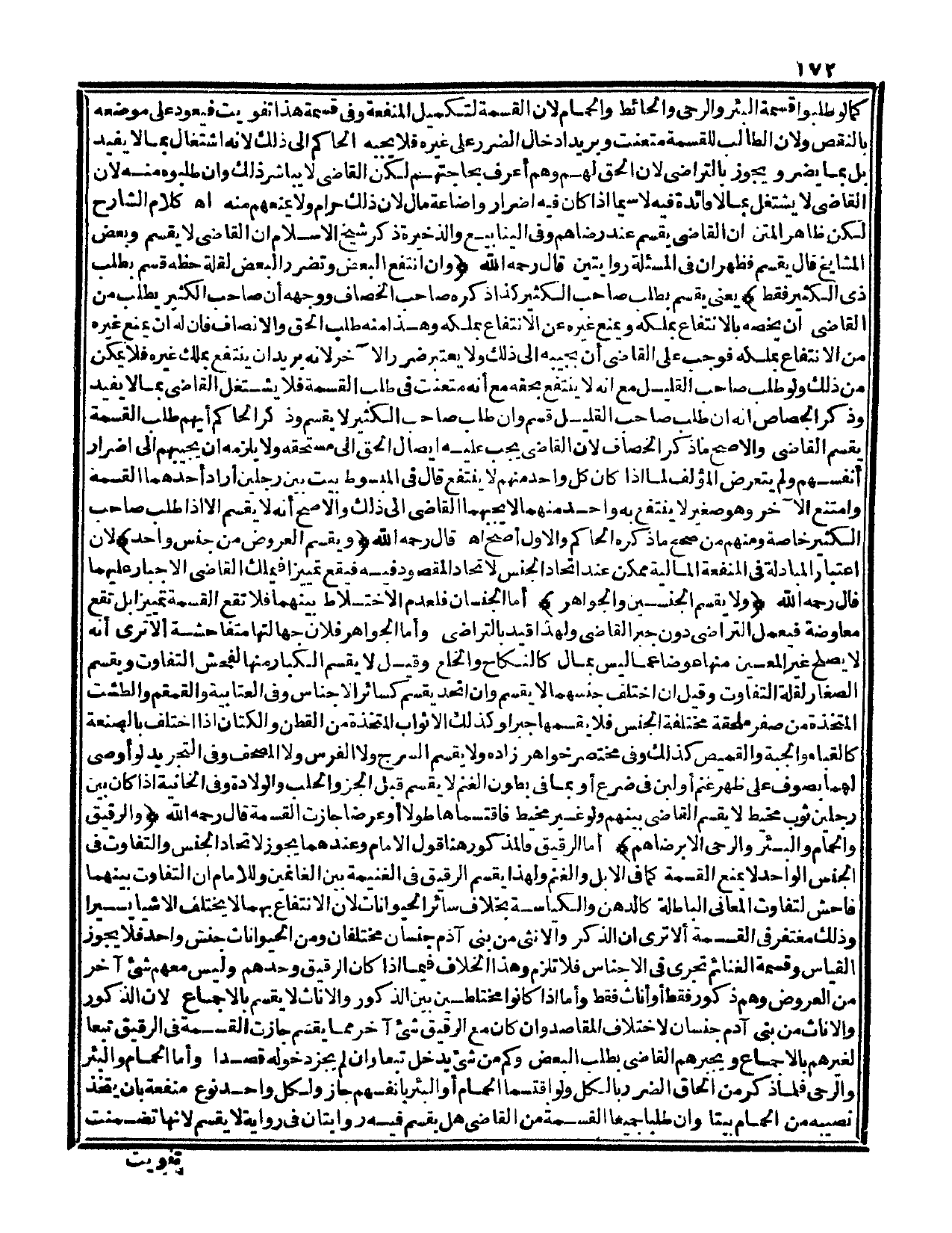 كَمَا لَوْ طَلَبُوا قِسْمَةَ الْبِئْرِ وَالرَّحَى وَالْحَائِطِ وَالْحَمَّامِ لِأَنَّ الْقِسْمَةَ لِتَكْمِيلِ الْمَنْفَعَةِ، وَفِي قِسْمَةِ هَذَا تَفْوِيتٌ فَيَعُودُ عَلَى مَوْضِعِهِ بِالنَّقْصِ وَلِأَنَّ الطَّالِبَ لِلْقِسْمَةِ مُتَعَنِّتٌ وَيُرِيدُ إدْخَالَ الضَّرَرِ عَلَى غَيْرِهِ فَلَا يُجِيبُهُ الْحَاكِمُ إلَى ذَلِكَ لِأَنَّهُ اشْتِغَالٌ بِمَا لَا يُفِيدُ بَلْ بِمَا يَضُرُّ وَيَجُوزُ بِالتَّرَاضِي لِأَنَّ الْحَقَّ لَهُمْ وَهُمْ أَعْرَفُ بِحَاجَتِهِمْ لَكِنَّ الْقَاضِيَ لَا يُبَاشِرُ ذَلِكَ، وَإِنْ طَلَبُوهُ مِنْهُ لِأَنَّ الْقَاضِيَ لَا يَشْتَغِلُ بِمَا لَا فَائِدَةَ فِيهِ لَا سِيَّمَا إذَا كَانَ فِيهِ إضْرَارٌ وَإِضَاعَةُ مَالٍ لِأَنَّ ذَلِكَ حَرَامٌ وَلَا يَمْنَعُ مِنْهُ اهـ.