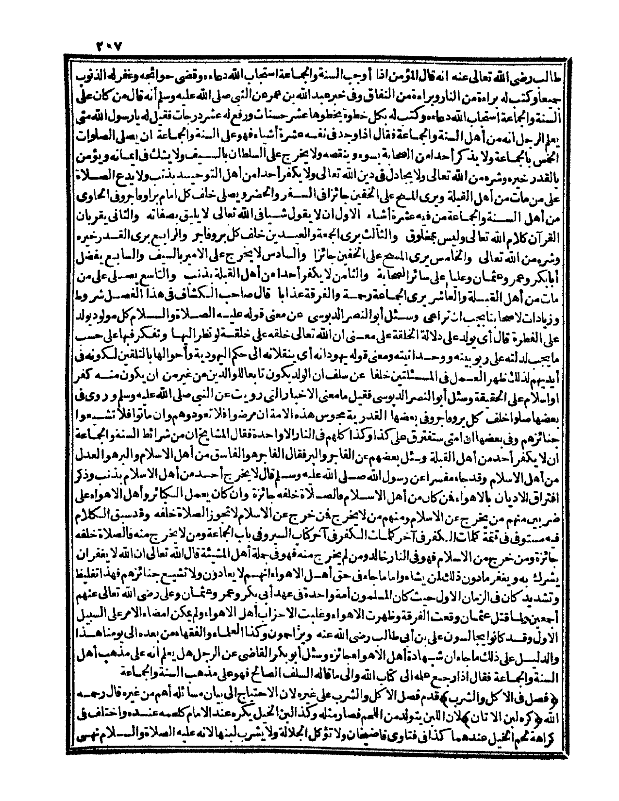 وَفِي الْحَاوِي مِنْ أَهْلِ السُّنَّةِ وَالْجَمَاعَةِ مَنْ فِيهِ عَشَرَةُ أَشْيَاءَ: الْأَوَّلُ أَنْ لَا يَقُولَ شَيْئًا فِي اللَّهِ تَعَالَى لَا يَلِيقُ بِصِفَاتِهِ. وَالثَّانِي: يُقِرُّ بِأَنَّ الْقُرْآنَ كَلَامُ اللَّهِ تَعَالَى وَلَيْسَ بِمَخْلُوقٍ. الثَّالِثُ: يَرَى الْجُمُعَةَ وَالْعِيدَيْنِ خَلْفَ كُلِّ بَرٍّ وَفَاجِرٍ. وَالرَّابِعُ: يَرَى الْقَدَرَ خَيْرَهُ وَشَرَّهُ مِنْ اللَّهِ تَعَالَى. وَالْخَامِسُ: يَرَى الْمَسْحَ عَلَى الْخُفَّيْنِ جَائِزًا. وَالسَّادِسُ: لَا يَخْرُجُ عَلَى الْأَمِيرِ بِالسَّيْفِ. وَالسَّابِعُ: يُفَضِّلُ أَبَا بَكْرٍ وَعُمَرَ وَعُثْمَانَ وَعَلِيًّا عَلَى سَائِرِ الصَّحَابَةِ. وَالثَّامِنُ: لَا يُكَفِّرُ أَحَدًا مِنْ أَهْلِ الْقِبْلَةِ بِذَنْبٍ. وَالتَّاسِعُ: يُصَلِّي عَلَى مَنْ مَاتَ مِنْ أَهْلِ الْقِبْلَةِ. وَالْعَاشِرُ: يَرَى الْجَمَاعَةَ رَحْمَةً وَالْفُرْقَةَ عَذَابًا.