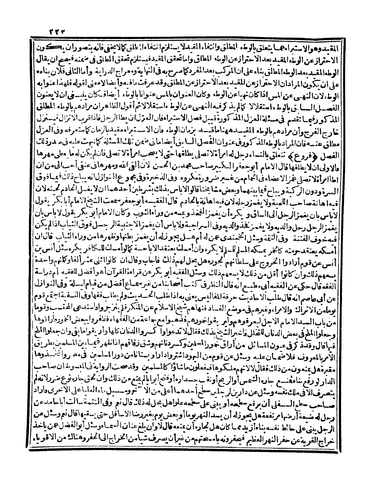 سُئِلَ أَنَسُ بْنُ أَنَسٍ عَنْ قَوْمٍ أَرَادُوا الْخُرُوجَ عَلَى سُلْطَانِهِمْ لِجَوْرِهِ هَلْ يَحِلُّ لَهُمْ ذَلِكَ فَأَجَابَ وَقَالَ: إنْ كَانُوا اثْنَيْ عَشَرَ أَلْفًا - وَكَلِمَتُهُمْ وَاحِدَةٌ - يَسَعُهُمْ ذَلِكَ وَإِنْ كَانُوا أَقَلَّ مِنْ ذَلِكَ لَا يَسَعُهُمْ ذَلِكَ وَسُئِلَ الْفَقِيهُ أَبُو بَكْرٍ عَنْ قِرَاءَةِ الْقُرْآنِ أَهُوَ أَفْضَلُ لِلْفَقِيهِ أَمْ دِرَاسَةُ الْفِقْهِ قَالَ: حُكِيَ عَنْ الْفَقِيهِ أَبِي مُطِيعٍ أَنَّهُ قَالَ النَّظَرُ فِي كُتُبِ أَصْحَابِنَا مِنْ غَيْرِ سَمَاعٍ أَفْضَلُ مِنْ قِيَامِ لَيْلَةٍ وَفِي النَّوَازِلِ عَنْ أَبِي عَاصِمٍ أَنَّهُ قَالَ طَلَبُ الْأَحَادِيثِ حِرْفَةُ الْمَفَالِيسِ يَعْنِي بِهِ إذَا طَلَبَ الْحَدِيثَ وَلَمْ يَطْلُبْ فِقْهًا وَفِي النَّسَفِيَّةِ اجْتَمَعَ قَوْمٌ يَوْمًا مِنْ الْأَتْرَاكِ وَالْأُمَرَاءِ وَغَيْرِهِمْ فِي مَوْضِعِ الْفَسَادِ فَنَهَاهُمْ شَيْخُ الْإِسْلَامِ عَنْ الْمُنْكَرِ فَلَمْ يَنْزَجِرُوا فَاسْتَدْعَى الْمُحْتَسِبَ وَقَوْمًا مِنْ بَابِ السَّيِّدِ الْإِمَامِ الْأَجَلِّ لِيَعْرِفُوهُمْ وَلِيُرِيقُوا خُمُورَهُمْ فَذَهَبُوا مَعَ جَمَاعَةٍ مِنْ الْفُقَهَاءِ فَظَفِرُوا بِبَعْضِ الْخُمُورِ فَأَرَاقُوهَا وَجَعَلُوا الْمِلْحَ فِي بَعْضِ الدِّنَانِ لِلتَّخَلُّلِ فَأُخْبِرَ الشَّيْخُ بِذَلِكَ فَقَالَ لَا تَدَعُوا وَاكْسِرُوا الدِّنَانَ كُلَّهَا، وَأَرِيقُوا مَا بَقِيَ وَإِنْ جَعَلُوا الْمِلْحَ فِيهَا قَالَ: وَقَدْ ذَكَرَ فِي عُيُونِ الْمَسَائِلِ مَنْ أَرَاقَ خُمُورَ الْمُسْلِمِينَ وَكَسَرَ دِنَانَهُمْ وَشَقَّ زِقَاقَهُمْ إذَا ظَهَرَ فِيمَا بَيْنَ الْمُسْلِمِينَ بِطَرِيقِ الْأَمْرِ بِالْمَعْرُوفِ فَلَا ضَمَانَ عَلَيْهِ وَسُئِلَ عَنْ قَوْمٍ مِنْ الْيَهُودِ اشْتَرَوْا دَارًا وَبُسْتَانًا مِنْ دُورِ الْمُسْلِمِينَ فِي مِصْرَ وَاتَّخَذُوهَا مَقْبَرَةً هَلْ يُمْنَعُونَ مِنْ ذَلِكَ فَقَالَ لَا لِأَنَّهُمْ مَلَكُوهَا فَيَفْعَلُونَ مَا شَاءُوا كَالْمُسْلِمِينَ.