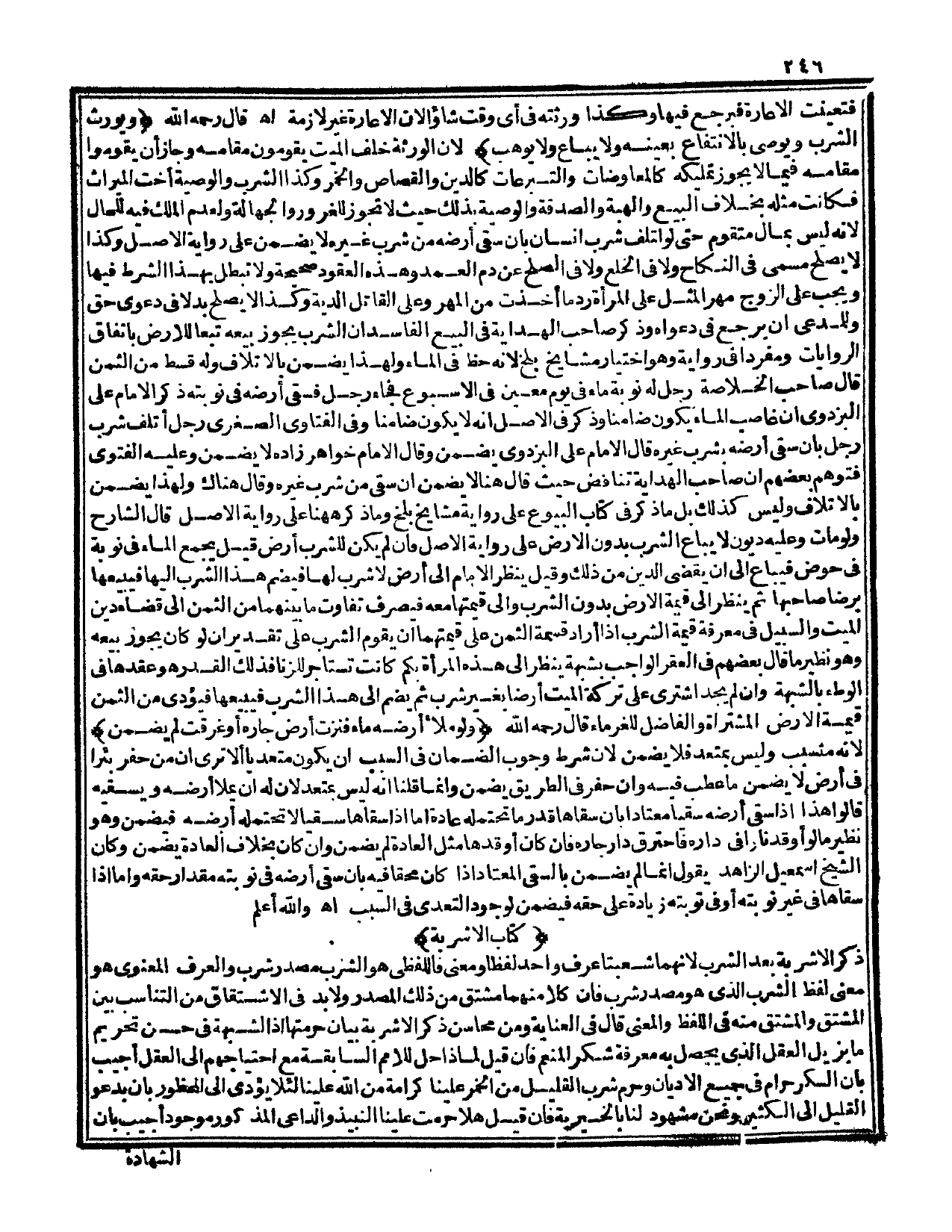 قَالَ الْإِمَامُ عَلِيٌّ الْبَزْدَوِيُّ: يَضْمَنُ، وَقَالَ الْإِمَامُ خواهر زاده لَا يَضْمَنُ وَعَلَيْهِ الْفَتْوَى فَتَوَهَّمَ بَعْضُهُمْ أَنَّ صَاحِبَ الْهِدَايَةِ تَنَاقَضَ حَيْثُ قَالَ هُنَا لَا يَضْمَنُ إنْ سَقَى مِنْ شِرْبِ غَيْرِهِ وَقَالَ هُنَاكَ وَلِهَذَا يَضْمَنُ بِالْإِتْلَافِ وَلَيْسَ كَذَلِكَ بَلْ مَا ذَكَرَ فِي كِتَابِ الْبُيُوعِ عَلَى رِوَايَةِ مَشَايِخِ بَلْخٍ وَمَا ذَكَرَ هَهُنَا عَلَى رِوَايَةِ الْأَصْلِ قَالَ الشَّارِحُ وَلَوْ مَاتَ وَعَلَيْهِ دُيُونٌ لَا يُبَاعُ الشِّرْبُ بِدُونِ الْأَرْضِ عَلَى رِوَايَةِ الْأَصْلِ فَإِنْ لَمْ يَكُنْ لِلشِّرْبِ أَرْضٌ قِيلَ يُجْمَعُ الْمَاءُ فِي نَوْبَةٍ فِي حَوْضٍ فَيُبَاعُ إلَى أَنْ يُقْضَى الدَّيْنُ مِنْ ذَلِكَ وَقِيلَ: يَنْظُرُ الْإِمَامُ إلَى أَرْضٍ لَا شِرْبَ لَهَا فَيَضُمُّ هَذَا الشِّرْبَ إلَيْهَا فَيَبِيعُهَا بِرِضَا صَاحِبِهَا ثُمَّ يَنْظُرُ إلَى قِيمَةِ الْأَرْضِ بِدُونِ الشِّرْبِ وَإِلَى قِيمَتِهَا مَعَهُ فَيَصْرِفُ تَفَاوُتَ مَا بَيْنِهِمَا مِنْ الثَّمَنِ إلَى قَضَاءِ دَيْنِ الْمَيِّتِ وَالسَّبِيلُ فِي مَعْرِفَةِ قِيمَةِ الشِّرْبِ إذَا أَرَادَ قِسْمَةَ الثَّمَنِ عَلَى قِيمَتِهِمَا أَنْ يُقَوِّمَ الشِّرْبَ عَلَى تَقْدِيرِ أَنْ لَوْ كَانَ يَجُوزُ بَيْعُهُ وَهُوَ نَظِيرُ مَا قَالَ بَعْضُهُمْ فِي الْعُقْرِ الْوَاجِبِ بِشُبْهَةٍ: يُنْظَرُ إلَى هَذِهِ الْمَرْأَةِ بِكَمْ كَانَتْ تُسْتَأْجَرُ لِلزِّنَا فَذَلِكَ الْقَدْرُ هُوَ عَقْدُهَا فِي الْوَطْءِ بِالشُّبْهَةِ. وَإِنْ لَمْ يَجِدْ اشْتَرَى عَلَى تَرِكَةِ الْمَيِّتِ أَرْضًا بِغَيْرِ شِرْبٍ ثُمَّ يَضُمُّ إلَى هَذَا الشِّرْبِ فَيَبِيعُهَا فَيُؤَدِّي مِنْ الثَّمَنِ قِيمَةَ الْأَرْضِ الْمُشْتَرَاةِ، وَالْفَاضِلُ لِلْغُرَمَاءِ.