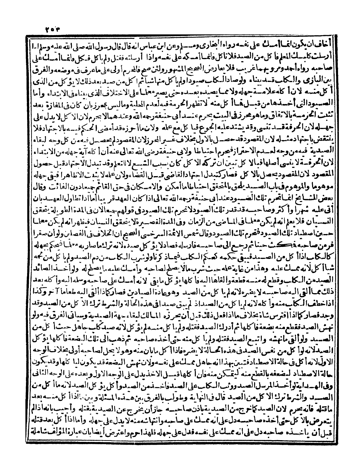 أَخَافُ أَنْ يَكُونَ إنَّمَا أَمْسَكَ عَلَى نَفْسِهِ» رَوَاهُ الْبُخَارِيُّ وَمُسْلِمٌ وَعَنْ ابْنِ عَبَّاسٍ أَنَّهُ قَالَ قَالَ رَسُولُ اللَّهِ - صَلَّى اللَّهُ عَلَيْهِ وَسَلَّمَ - «إذَا أَرْسَلْتَ كَلْبَكَ الْمُعَلَّمَ فَأَكَلَ مِنْ الصَّيْدِ فَلَا تَأْكُلْ فَإِنَّمَا أَمْسَكَهُ عَلَى نَفْسِهِ وَإِذَا أَرْسَلْتَهُ فَقَتَلَ وَلَمْ يَأْكُلْ فَكُلْ فَإِنَّمَا أَمْسَكَ عَلَى صَاحِبِهِ» رَوَاهُ أَحْمَدُ وَمَرْوِيُّهُمَا غَرِيبٌ فَلَا يُعَارِضُ الصَّحِيحَ الْمَشْهُورَ وَلَئِنْ صَحَّ فَالْمُحَرَّمُ أَوْلَى عَلَى مَا عُرِفَ فِي مَوْضِعِهِ، وَالْفَرْقُ بَيْنَ الْبَازِي وَالْكَلْبِ قَدْ بَيَّنَّاهُ.
