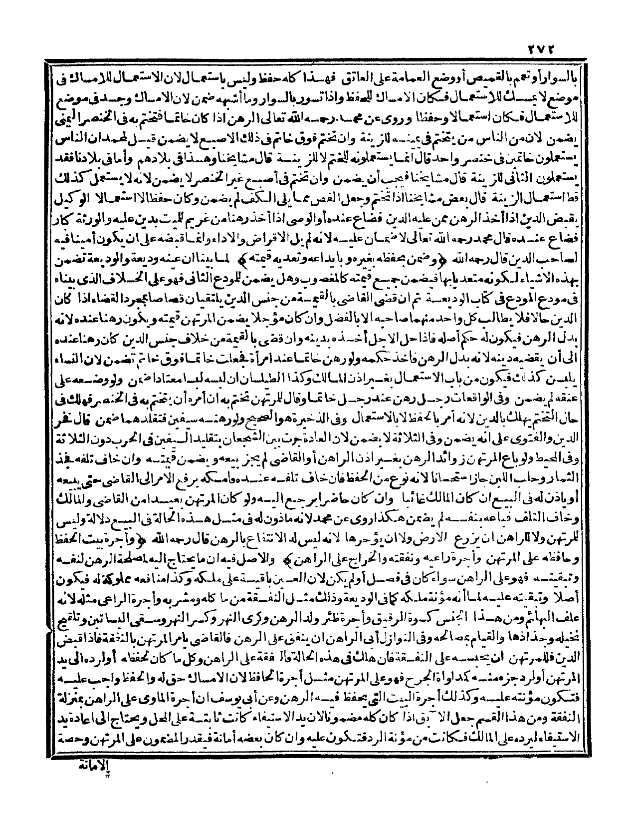 بِالسِّوَارِ أَوْ تَعَمَّمَ بِالْقَمِيصِ أَوْ وَضَعَ الْعِمَامَةَ عَلَى الْعَاتِقِ فَهَذَا كُلُّهُ حِفْظٌ، وَلَيْسَ بِاسْتِعْمَالٍ؛ لِأَنَّ الِاسْتِعْمَالَ لِلْإِمْسَاكِ فِي مَوْضِعٍ لَا يُمْسَكُ لِلِاسْتِعْمَالِ فَكَانَ الْإِمْسَاكُ لِلْحِفْظِ وَإِذَا تَسَوَّرَ بِالسِّوَارِ وَمَا أَشْبَهَ ضَمِنَ؛ لِأَنَّ الْإِمْسَاكَ وُجِدَ فِي مَوْضِعٍ لِلِاسْتِعْمَالِ فَكَانَ اسْتِعْمَالًا وَحِفْظًا. وَرُوِيَ عَنْ مُحَمَّدٍ - رَحِمَهُ اللَّهُ تَعَالَى - الرَّهْنُ إذَا كَانَ خَاتَمًا فَتَخَتَّمَ بِهِ فِي الْخِنْصَرِ الْيُمْنَى يَضْمَنُ؛ لِأَنَّ مِنْ النَّاسِ مَنْ يَتَخَتَّمُ فِي يَمِينِهِ لِلزِّينَةِ، وَإِنْ تَخَتَّمَ فَوْقَ خَاتَمٍ فِي ذَلِكَ الْإِصْبَعِ لَا يَضْمَنُ قِيلَ لِمُحَمَّدٍ إنَّ النَّاسَ يَسْتَعْمِلُونَ خَاتَمَيْنِ فِي خِنْصَرٍ وَاحِدٍ قَالَ إنَّمَا يَسْتَعْمِلُونَهُ لِلْخَتْمِ لَا لِلزِّينَةِ، قَالَ مَشَايِخُنَا: وَهَذَا فِي بِلَادِهِمْ، وَأَمَّا فِي بِلَادِنَا فَقَدْ يَسْتَعْمِلُونَ الثَّانِيَ لِلزِّينَةِ قَالَ مَشَايِخُنَا فَيَجِبُ أَنْ يَضْمَنَ، وَإِنْ تَخَتَّمَ فِي أُصْبُعٍ غَيْرِ الْخِنْصَرِ لَا يَضْمَنُ؛ لِأَنَّهُ لَا يَسْتَعْمِلُ كَذَلِكَ قَطُّ اسْتِعْمَالَ الزِّينَةِ، قَالَ بَعْضُ مَشَايِخِنَا: إذَا تَخَتَّمَ وَجَعَلَ الْفَصَّ مِمَّا يَلِي فِي الْكَفِّ لَمْ يَضْمَنْ وَكَانَ حِفْظًا لَا اسْتِعْمَالًا الْوَكِيلُ يَقْبِضُ الدَّيْنَ إذَا أَخَذَ الرَّهْنَ مِمَّنْ عَلَيْهِ الدَّيْنُ فَضَاعَ عِنْدَهُ أَوْ الْوَصِيُّ إذَا أَخَذَ رَهْنًا مِنْ غَرِيمٍ لِلْمَيِّتِ بِدَيْنٍ عَلَيْهِ وَالْوَرَثَةُ كِبَارٌ فَضَاعَ عِنْدَهُ قَالَ مُحَمَّدٌ - رَحِمَهُ اللَّهُ تَعَالَى - لَا ضَمَانَ عَلَيْهِ؛ لِأَنَّهُ لَمْ يَلِ الْإِقْرَاضَ وَالْأَدَاءَ وَإِنَّمَا قَبَضَهُ عَلَى أَنْ يَكُونَ أَمِينًا فِيهِ لِصَاحِبِ الدَّيْنِ.