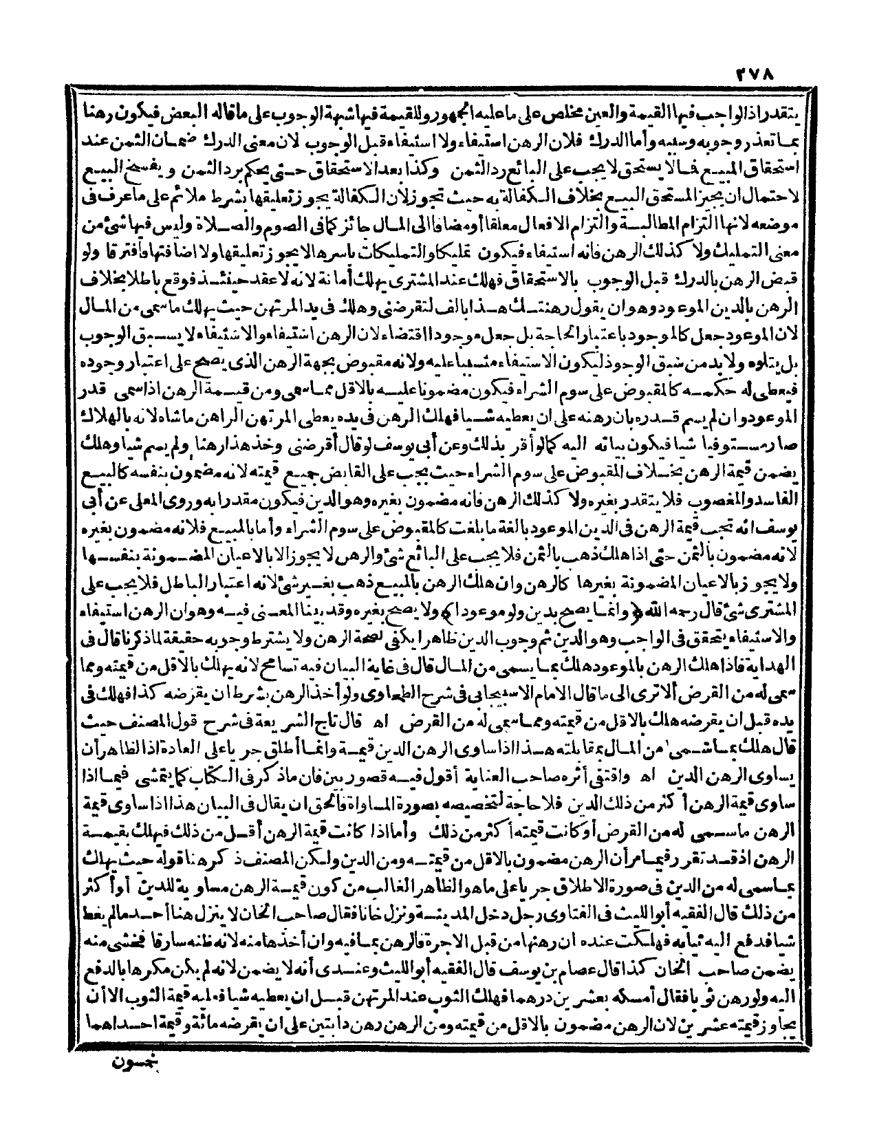 وَاقْتَفَى أَثَرَهُ صَاحِبُ الْعِنَايَةِ أَقُولُ: فِيهِ قُصُورٌ بَيِّنٌ، فَإِنَّ مَا ذَكَرَ فِي الْكِتَابِ كَمَا يَتَمَشَّى فِيمَا إذَا سَاوَى قِيمَةُ الرَّهْنِ أَكْثَرَ مِنْ ذَلِكَ الدَّيْنِ فَلَا حَاجَةَ لِتَخْصِيصِهِ بِصُورَةِ الْمُسَاوَاةِ فَالْحَقُّ أَنْ يُقَالَ فِي الْبَيَانِ هَذَا إذَا سَاوَى قِيمَةَ الرَّهْنِ مَا سُمِّيَ لَهُ مِنْ الْقَرْضِ أَوْ كَانَتْ قِيمَتُهُ أَكْثَرَ مِنْ ذَلِكَ. وَأَمَّا إذَا كَانَتْ قِيمَةُ الرَّهْنِ أَقَلَّ مِنْ ذَلِكَ فَيَهْلِكُ بِقِيمَةِ الرَّهْنِ إذَا فَسَدَ تَقَرَّرَ فِيمَا مَرَّ أَنَّ الرَّهْنَ مَضْمُونٌ بِالْأَقَلِّ مِنْ قِيمَتِهِ وَمِنْ الدَّيْنِ وَلَكِنْ الْمُصَنِّفُ ذَكَرَ هُنَا قَوْلَهُ حَيْثُ يَهْلِكُ بِمَا سَمَّى لَهُ مِنْ الدَّيْنِ فِي صُورَةِ الْإِطْلَاقِ جَرْيًا عَلَى مَا هُوَ الظَّاهِرُ الْغَالِبُ مِنْ كَوْنِ قِيمَةِ الرَّهْنِ مُسَاوِيَةً لِلدَّيْنِ أَوْ أَكْثَرَ مِنْ ذَلِكَ قَالَ الْفَقِيهُ أَبُو اللَّيْثِ فِي الْفَتَاوَى رَجُلٌ دَخَلَ الْمَدِينَةَ وَنَزَلَ خَانًا، فَقَالَ صَاحِبُ الْخَانِ لَا يَنْزِلُ هُنَا أَحَدٌ مَا لَمْ يُعْطِ شَيْئًا فَدَفَعَ إلَيْهِ ثِيَابَهُ فَهَلَكَتْ عِنْدَهُ إنْ رَهَنَهَا مِنْ قَبْلِ الْأُجْرَةِ فَالرَّهْنُ بِمَا فِيهِ، وَإِنْ أَخَذَهَا مِنْهُ؛ لِأَنَّهُ ظَنَّهُ سَارِقًا فَخَشِيَ مِنْهُ يَضْمَنُ صَاحِبُ الْخَانِ، كَذَا قَالَ عِصَامُ بْنُ يُوسُفَ قَالَ الْفَقِيهُ أَبُو اللَّيْثِ وَعِنْدِي أَنَّهُ لَا يَضْمَنُ؛ لِأَنَّهُ لَمْ يَكُنْ مُكْرَهًا بِالدَّفْعِ إلَيْهِ، وَلَوْ رَهَنَ ثَوْبًا، فَقَالَ أَمْسِكْهُ بِعِشْرِينَ دِرْهَمًا فَهَلَكَ الثَّوْبُ عِنْدَ الْمُرْتَهِنِ قَبْلَ أَنْ يُعْطِيَهُ شَيْئًا فَعَلَيْهِ قِيمَةُ الثَّوْبِ إلَّا أَنْ يُجَاوِزَ قِيمَتُهُ عِشْرِينَ؛ لِأَنَّ الرَّهْنَ مَضْمُونٌ بِالْأَقَلِّ مِنْ قِيمَتِهِ وَمِنْ الرَّهْنِ رَهْنُ دَابَّتَيْنِ عَلَى أَنْ يُقْرِضَهُ مِائَةً، وَقِيمَةُ إحْدَاهُمَا