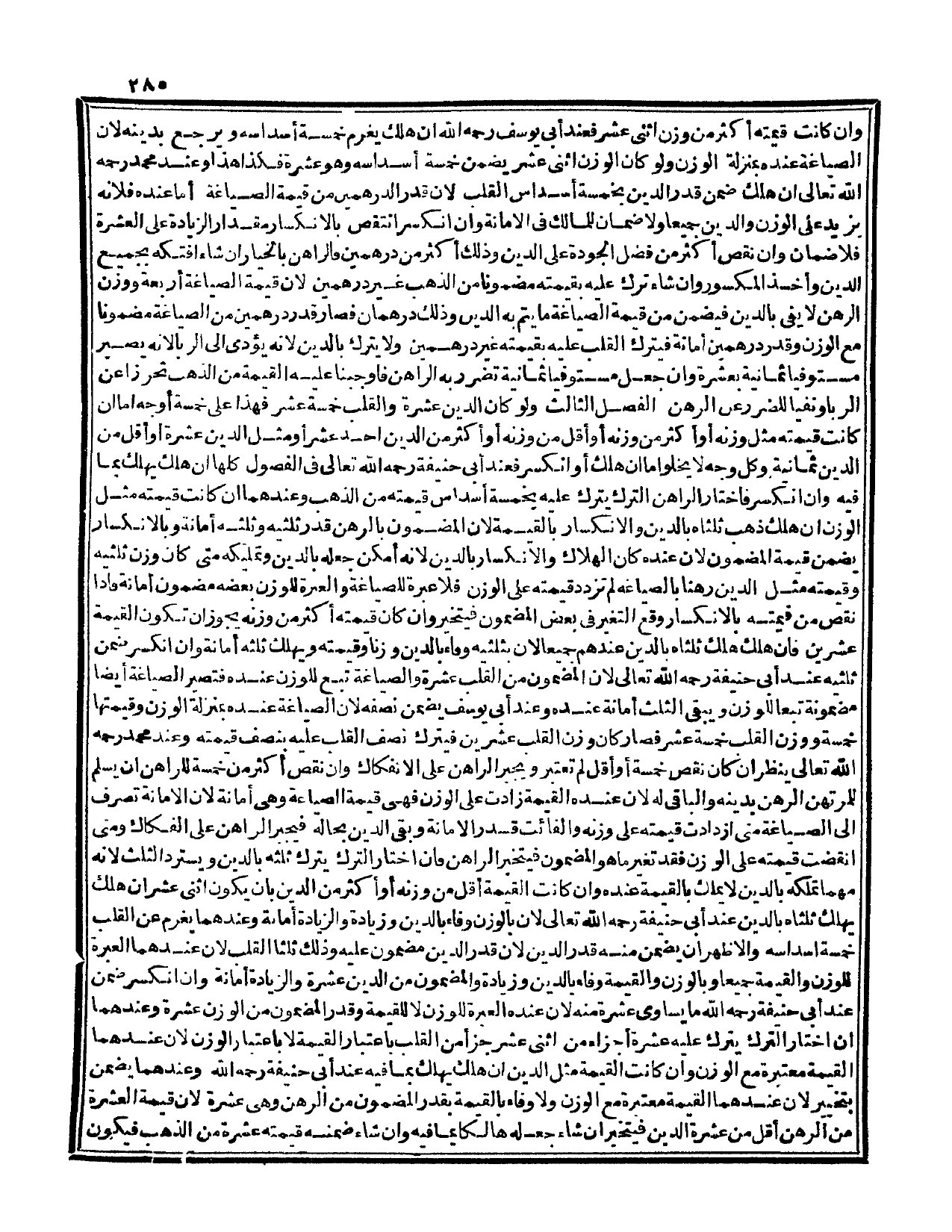 الْفَصْلُ الثَّالِثُ، وَلَوْ كَانَ الدَّيْنُ عَشَرَةً وَالْقُلْبُ خَمْسَةَ عَشَرَ فَهَذَا عَلَى خَمْسَةِ أَوْجُهٍ: إمَّا أَنْ كَانَتْ قِيمَتُهُ مِثْلَ وَزْنِهِ، أَوْ أَكْثَرَ مِنْ وَزْنِهِ، أَوْ أَقَلَّ مِنْ وَزْنِهِ، أَوْ أَكْثَرَ مِنْ الدَّيْنِ أَحَدَ عَشَرَ، أَوَمِثْلَ الدَّيْنِ عَشَرَةً، أَوْ أَقَلَّ مِنْ الدَّيْنِ ثَمَانِيَةً، وَكُلُّ وَجْهٍ لَا يَخْلُو إمَّا أَنْ هَلَكَ أَوْ انْكَسَرَ فَعِنْدَ أَبِي حَنِيفَةَ - رَحِمَهُ اللَّهُ تَعَالَى - فِي الْفُصُولِ كُلِّهَا إنْ هَلَكَ يَهْلِكُ بِمَا فِيهِ، وَإِنْ انْكَسَرَ فَاخْتَارَ الرَّاهِنُ التَّرْكَ يُتْرَكُ عَلَيْهِ بِخَمْسَةِ أَسْدَاسِ قِيمَتِهِ مِنْ الذَّهَبِ، وَعِنْدَهُمَا إنْ كَانَتْ قِيمَتُهُ مِثْلَ الْوَزْنِ إنْ هَلَكَ ذَهَبَ ثُلُثَاهُ بِالدَّيْنِ وَالِانْكِسَارِ بِالْقِيمَةِ؛ لِأَنَّ الْمَضْمُونَ بِالرَّهْنِ قَدْرُ ثُلُثَيْهِ وَثُلُثُهُ أَمَانَةٌ وَبِالِانْكِسَارِ يَضْمَنُ قِيمَةَ الْمَضْمُونِ؛ لِأَنَّ عِنْدَهُ كَانَ الْهَلَاكُ وَالِانْكِسَارُ بِالدَّيْنِ؛ لِأَنَّهُ أَمْكَنَ جَعْلُهُ بِالدَّيْنِ وَتَمْلِيكُهُ مَتَى كَانَ وَزْنَ ثُلُثَيْهِ وَقِيمَتُهُ مِثْلُ الدَّيْنِ رَهْنًا بِالصِّيَاغَةِ لَمْ تَزْدَدْ قِيمَتُهُ عَلَى الْوَزْنِ فَلَا عِبْرَةَ لِلصِّيَاغَةِ وَالْعِبْرَةُ لِلْوَزْنِ بَعْضُهُ مَضْمُونٌ أَمَانَةً، فَإِذَا نَقَصَ مِنْ قِيمَتِهِ بِالِانْكِسَارِ وَقَعَ التَّغَيُّرُ فِي بَعْضِ الْمَضْمُونِ فَيُتَخَيَّرُ، وَإِنْ كَانَ قِيمَتُهُ أَكْثَرَ مِنْ وَزْنِهِ يَجُوزُ أَنْ تَكُونَ الْقِيمَةُ عِشْرِينَ، فَإِنْ هَلَكَ هَلَكَ ثُلُثَاهُ بِالدَّيْنِ عِنْدَهُمْ جَمِيعًا؛ لِأَنَّ بِثُلُثَيْهِ وَفَاءً بِالدَّيْنِ وَزْنًا وَقِيمَتَهُ وَيَهْلِكُ ثُلُثُهُ أَمَانَةً، وَإِنْ انْكَسَرَ ضَمِنَ ثُلُثَيْهِ عِنْدَ أَبِي حَنِيفَةَ - رَحِمَهُ اللَّهُ تَعَالَى -؛ لِأَنَّ الْمَضْمُونَ مِنْ الْقُلْبِ عَشَرَةٌ وَالصِّيَاغَةُ تَبَعٌ لِلْوَزْنِ عِنْدَهُ فَتَصِيرُ الصِّيَاغَةُ أَيْضًا مَضْمُونَةً تَبَعًا لِلْوَزْنِ وَيَبْقَى الثُّلُثُ أَمَانَةً عِنْدَهُ.