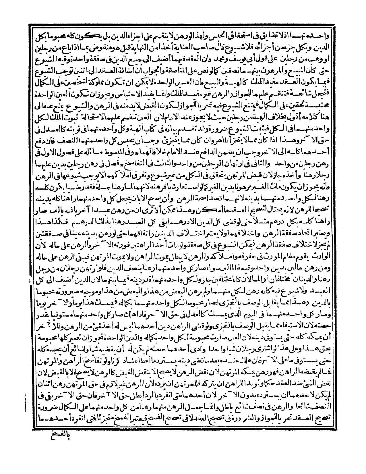 وَالْجَوَابُ أَنَّ إضَافَةَ الْعَقْدِ إلَى اثْنَيْنِ تُوجِبُ الشُّيُوعَ فِيمَا يَكُونُ الْعَقْدُ مُفِيدًا لِلْمِلْكِ كَالْهِبَةِ وَالْبَيْعِ، فَإِنَّ الْعَيْنَ الْوَاحِدَةَ لَا يُمْكِنُ أَنْ تَكُونَ مَمْلُوكَةً لِشَخْصَيْنِ عَلَى الْكَمَالِ فَتُجْعَلُ شَائِعَةً فَتَنْقَسِمُ عَلَيْهِمَا لِلْجَوَازِ وَالرَّهْنُ غَيْرُ مُفِيدٍ لِلْمِلْكِ وَإِنَّمَا يُفِيدُ الِاحْتِبَاسَ وَيَجُوزُ أَنْ تَكُونَ الْعَيْنُ الْوَاحِدَةُ مُحْتَبِسَةً لِحَقَّيْنِ عَلَى الْكَمَالِ فَيَمْتَنِعُ الشُّيُوعُ فِيهِ تَحَرِّيًا لِلْجَوَازِ لِكَوْنِ الْقَبْضِ لَا بُدَّ مِنْهُ فِي الرَّهْنِ وَالشُّيُوعُ يَمْنَعُ عَنْهُ إلَى هُنَا كَلَامُهُ أَقُولُ: بِخِلَافِ الْهِبَةِ مِنْ رَجُلَيْنِ حَيْثُ لَا يَجُوزُ عِنْدَ الْإِمَامِ؛ لِأَنَّ الْعَيْنَ تَنْقَسِمُ عَلَيْهِمَا لِاسْتِحَالَةِ ثُبُوتِ الْمِلْكِ لِكُلِّ وَاحِدٍ مِنْهُمَا فِي الْكُلِّ فَيَثْبُتُ الشُّيُوعُ ضَرُورَةً، وَقَدْ تَقَدَّمَ بَيَانُهُ فِي كِتَابِ الْهِبَةِ وَكُلُّ وَاحِدٍ مِنْهُمَا فِي نَوْبَتِهِ كَالْعَدْلِ فِي حَقِّ الْآخَرِ، وَهَذَا إذَا كَانَ مِمَّا لَا يَتَجَزَّأُ ظَاهِرٌ، وَإِنْ كَانَ مِمَّا يَتَجَزَّأُ وَجَبَ أَنْ يَحْبِسَ كُلُّ وَاحِدٍ مِنْهُمَا النِّصْفَ، فَإِنْ دَفَعَ أَحَدُهُمَا كُلَّهُ إلَى الْآخَرِ وَجَبَ أَنْ يَضْمَنَ الدَّافِعُ عِنْدَ الْإِمَامِ خِلَافًا لَهُمَا. وَفِي الْمَبْسُوطِ مَسَائِلُهُ عَلَى فُصُولٍ: الْأَوَّلُ فِي رَهْنِ رَجُلَيْنِ مِنْ وَاحِدٍ. وَالثَّانِي فِي ارْتِهَانِ الرَّجُلَيْنِ مِنْ وَاحِدٍ. وَالثَّالِثُ فِي التَّفَاسُخِ.