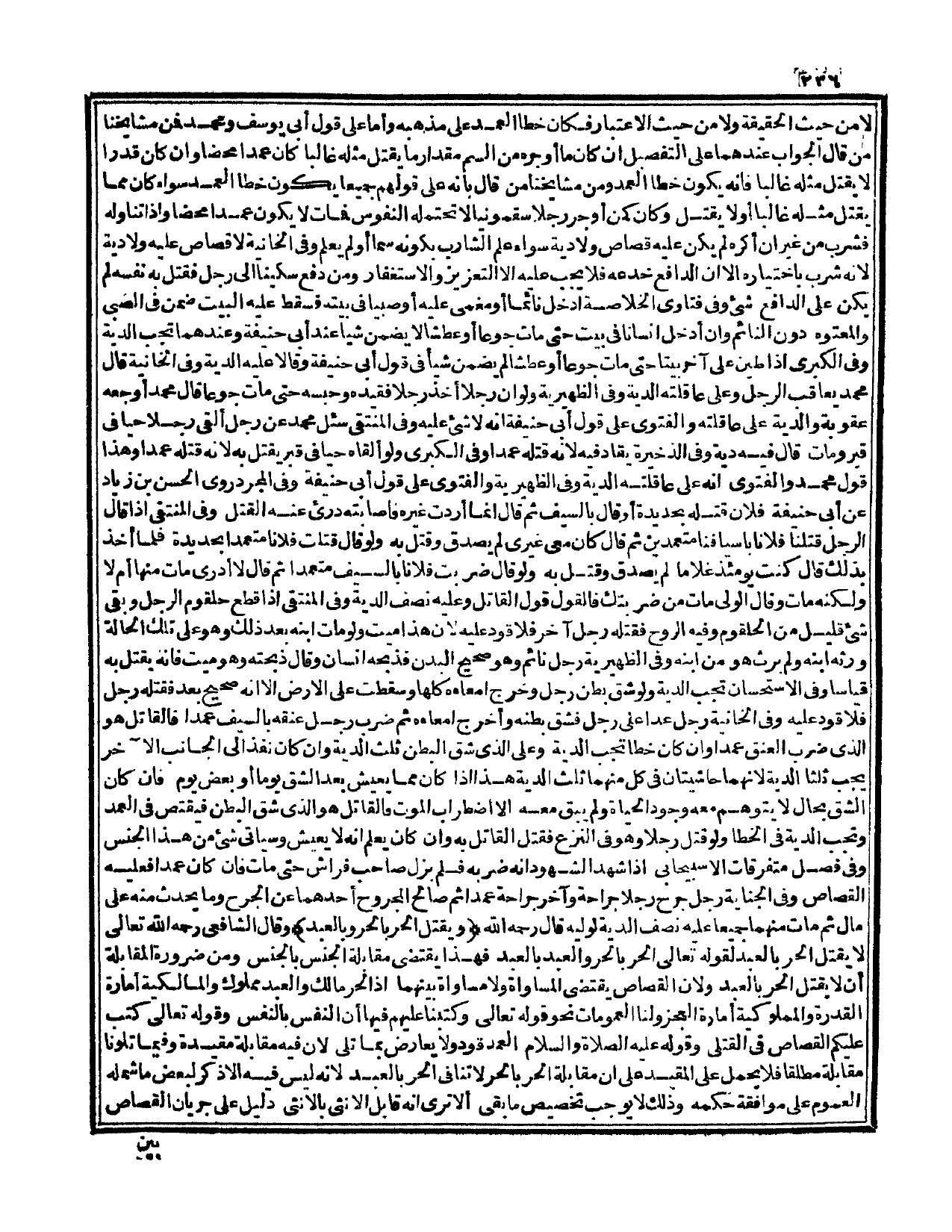 وَفِي الْمُنْتَقَى إذَا قَالَ الرَّجُلُ قَتَلْنَا فُلَانًا بِأَسْيَافِنَا مُتَعَمِّدِينَ ثُمَّ قَالَ كَانَ مَعِي غَيْرِي لَمْ يُصَدَّقْ وَقُتِلَ بِهِ، وَلَوْ قَالَ قَتَلْت فُلَانًا مُتَعَمِّدًا بِحَدِيدَةٍ فَلَمَّا أُخِذَ بِذَلِكَ قَالَ كُنْت يَوْمَئِذٍ غُلَامًا لَمْ يُصَدَّقْ وَقُتِلَ بِهِ، وَلَوْ قَالَ ضَرَبْت فُلَانًا بِالسَّيْفِ مُتَعَمِّدًا ثُمَّ قَالَ لَا أَدْرِي مَاتَ مِنْهَا أَمْ لَا وَلَكِنَّهُ مَاتَ وَقَالَ الْوَلِيُّ مَاتَ مِنْ ضَرْبَتِك فَالْقَوْلُ قَوْلُ الْقَاتِلِ وَعَلَيْهِ نِصْفُ الدِّيَةِ وَفِي الْمُنْتَقَى إذَا قَطَعَ حُلْقُومَ الرَّجُلِ وَبَقِيَ شَيْءٌ قَلِيلٌ مِنْ الْحُلْقُومِ وَفِيهِ الرُّوحُ فَقَتَلَهُ رَجُلٌ آخَرُ فَلَا قَوَدَ عَلَيْهِ؛ لِأَنَّ، هَذَا مَيِّتٌ، وَلَوْ مَاتَ ابْنُهُ بَعْدَ ذَلِكَ، وَهُوَ عَلَى تِلْكَ الْحَالَةِ وَرِثَهُ ابْنُهُ وَلَمْ يَرِثْ هُوَ مِنْ ابْنِهِ وَفِي الظَّهِيرِيَّةِ رَجُلٌ نَائِمٌ، وَهُوَ صَحِيحُ الْبَدَنِ فَذَبَحَهُ إنْسَانٌ وَقَالَ ذَبَحْته، وَهُوَ مَيِّتٌ، فَإِنَّهُ يُقْتَلُ بِهِ قِيَاسًا وَفِي الِاسْتِحْسَانِ تَجِبُ الدِّيَةُ، وَلَوْ شَقَّ بَطْنَ رَجُلٍ وَخَرَّجَ أَمْعَاءَهُ كُلَّهَا وَسَقَطَتْ عَلَى الْأَرْضِ إلَّا أَنَّهُ صَحِيحٌ بَعْدُ فَقَتَلَهُ رَجُلٌ فَلَا قَوَدَ عَلَيْهِ وَفِي الْخَانِيَّةِ رَجُلٌ عَدَا عَلَى رَجُلٍ فَشَقَّ بَطْنَهُ وَأَخْرَجَ أَمْعَاءَهُ ثُمَّ ضَرَبَ رَجُلٌ عُنُقَهُ بِالسَّيْفِ عَمْدًا فَالْقَاتِلُ هُوَ الَّذِي ضَرَبَ الْعُنُقَ عَمْدًا، وَإِنْ كَانَ خَطَأً تَجِبُ الدِّيَةُ وَعَلَى الَّذِي شَقَّ الْبَطْنَ ثُلُثُ الدِّيَةِ، وَإِنْ كَانَ نَفَذَ إلَى الْجَانِبِ الْآخَرِ يَجِبُ ثُلُثَا الدِّيَةِ؛ لِأَنَّهُمَا حَاشِيَتَانِ فِي كُلٍّ مِنْهُمَا ثُلُثُ الدِّيَةِ، هَذَا إذَا كَانَ مِمَّا يَعِيشُ بَعْدَ الشَّقِّ يَوْمًا أَوْ بَعْضَ يَوْمٍ، فَإِنْ كَانَ الشَّقُّ بِحَالٍ لَا يُتَوَهَّمُ مَعَهُ وُجُودُ الْحَيَاةِ، وَلَمْ يَبْقَ مَعَهُ إلَّا اضْطِرَابُ الْمَوْتِ، فَالْقَاتِلُ هُوَ الَّذِي شَقَّ الْبَطْنَ فَيُقْتَصُّ فِي الْعَمْدِ وَتَجِبُ الدِّيَةُ فِي الْخَطَأِ، وَلَوْ قَتَلَ رَجُلًا، وَهُوَ فِي النَّزْعِ فَقُتِلَ الْقَاتِلُ بِهِ، وَإِنْ كَانَ يَعْلَمُ أَنَّهُ لَا يَعِيشُ وَسَيَأْتِي شَيْءٌ مِنْ هَذَا الْجِنْسِ وَفِي فَصْلِ مُتَفَرِّقَاتِ الْإِسْبِيجَابِيِّ إذَا شَهِدَ الشُّهُودُ أَنَّهُ ضَرَبَهُ فَلَمْ يَزَلْ صَاحِبُ فِرَاشٍ حَتَّى مَاتَ، فَإِنْ كَانَ عَمْدًا فَعَلَيْهِ الْقِصَاصُ وَفِي الْجِنَايَةِ رَجُلٌ جَرَحَ رَجُلًا جِرَاحَةً وَآخَرَ جِرَاحَةً عَمْدًا ثُمَّ صَالَحَ الْمَجْرُوحُ أَحَدَهُمَا عَنْ الْجُرْحِ وَمَا يَحْدُثُ مِنْهُ عَلَى مَالٍ ثُمَّ مَاتَ مِنْهُمَا جَمِيعًا عَلَيْهِ نِصْفُ الدِّيَةِ لِوَلِيِّهِ.