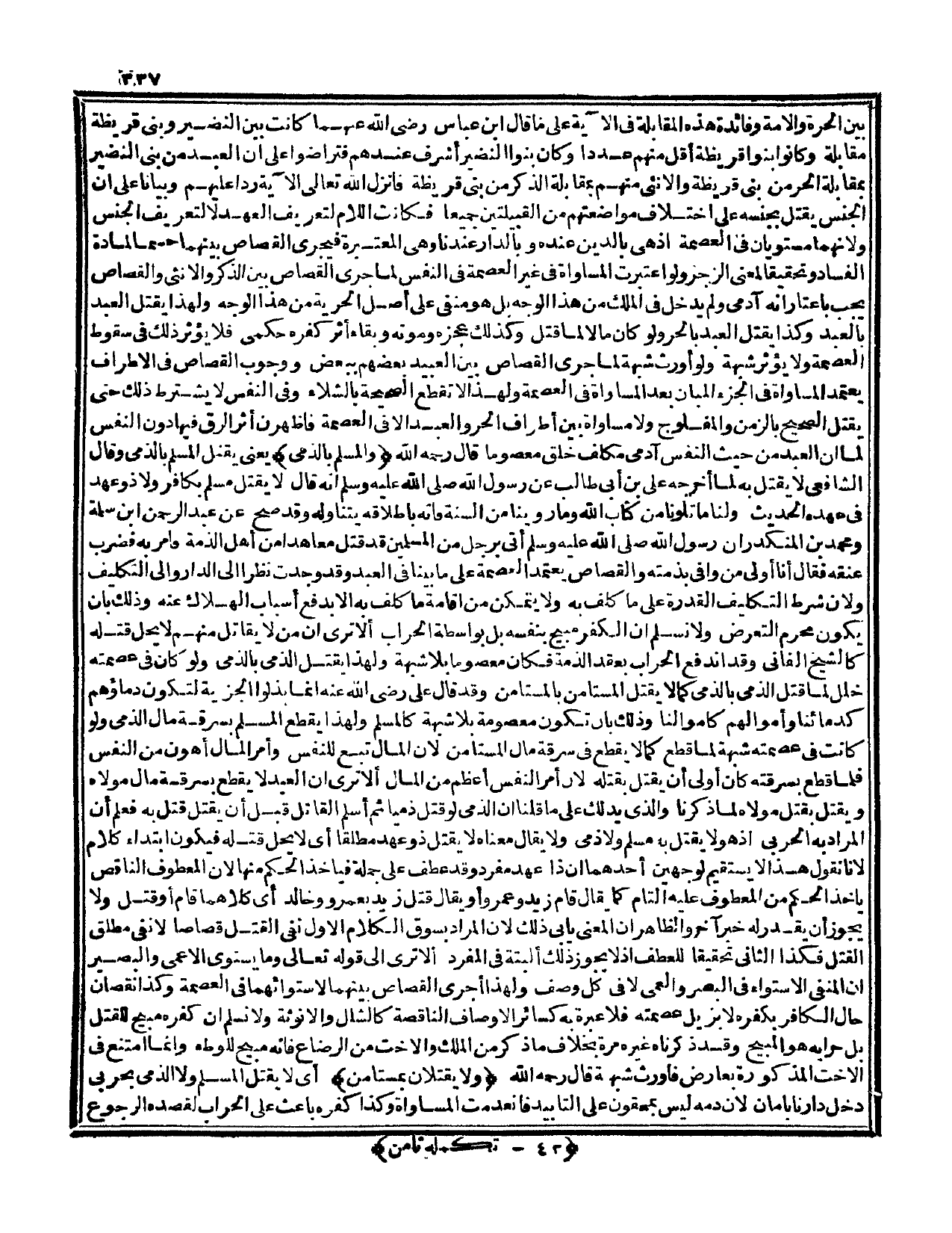 بَيْنَ الْحُرَّةِ وَالْأَمَةِ وَفَائِدَةُ هَذِهِ الْمُقَابَلَةِ فِي الْآيَةِ عَلَى مَا قَالَ ابْنُ عَبَّاسٍ - رَضِيَ اللَّهُ عَنْهُمَا - كَانَتْ بَيْنَ بَنِي النَّضِيرِ وَبَنِي قُرَيْظَةَ مُقَابَلَةٌ وَكَانَ بَنُو قُرَيْظَةَ أَقَلَّ مِنْهُمْ عَدَدًا، وَكَانَ بَنُو النَّضِيرِ أَشْرَفَ عِنْدَهُمْ فَتَرَاضَوْا عَلَى أَنَّ الْعَبْدَ مِنْ بَنِي النَّضِيرِ بِمُقَابَلَةِ الْحُرِّ مِنْ بَنِي قُرَيْظَةَ وَالْأُنْثَى مِنْهُمْ بِمُقَابَلَةِ الذَّكَرِ مِنْ بَنِي قُرَيْظَةَ فَأَنْزَلَ اللَّهُ تَعَالَى الْآيَةَ رَدًّا عَلَيْهِمْ وَبَيَانًا عَلَى أَنَّ الْجِنْسَ يُقْتَلُ بِجِنْسِهِ عَلَى اخْتِلَافِ مُوَاضَعَتِهِمْ مِنْ الْقَبِيلَتَيْنِ جَمِيعًا فَكَانَتْ اللَّامُ لِتَعْرِيفِ الْعَهْدِ لَا لِتَعْرِيفِ الْجِنْسِ؛ وَلِأَنَّهُمَا مُسْتَوِيَانِ فِي الْعِصْمَةِ إذْ هِيَ بِالدَّيْنِ عِنْدَهُ وَبِالدَّارِ عِنْدَنَا، وَهِيَ الْمُعْتَبَرَةُ فَيَجْرِي الْقِصَاصُ بَيْنَهُمَا حَسْمًا لِمَادَّةِ الْفَسَادِ وَتَحْقِيقًا لِمَعْنَى الزَّجْرِ، وَلَوْ اُعْتُبِرَتْ الْمُسَاوَاةُ فِي غَيْرِ الْعِصْمَةِ فِي النَّفْسِ لَمَا جَرَى الْقِصَاصُ بَيْنَ الذَّكَرِ وَالْأُنْثَى وَالْقِصَاصُ يَجِبُ بِاعْتِبَارِ أَنَّهُ آدَمِيٌّ وَلَمْ يَدْخُلْ فِي الْمِلْكِ مِنْ، هَذَا الْوَجْهِ بَلْ هُوَ مَنْفِيٌّ عَلَى أَصْلِ الْحُرِّيَّةِ مِنْ، هَذَا الْوَجْهِ؛ وَلِهَذَا يُقْتَلُ الْعَبْدُ بِالْعَبْدِ وَكَذَا يُقْتَلُ الْعَبْدُ بِالْحُرِّ، وَلَوْ كَانَ مَالًا لَمَا قُتِلَ وَكَذَلِكَ عَجْزُهُ وَمَوْتُهُ وَبَقَاءُ أَثَرِ كُفْرِهِ حُكْمِيٌّ فَلَا يُؤَثِّرُ ذَلِكَ فِي سُقُوطِ الْعِصْمَةِ وَلَا يُؤَثِّرُ شُبْهَةً، وَلَوْ أَوْرَثَ شُبْهَةً لَمَا جَرَى الْقِصَاصُ بَيْنَ الْعَبِيدِ بَعْضِهِمْ بِبَعْضٍ وَوُجُوبُ الْقِصَاصِ فِي الْأَطْرَافِ يَعْتَمِدُ الْمُسَاوَاةَ فِي الْجُزْءِ الْمُبَانِ بَعْدَ الْمُسَاوَاةِ فِي الْعِصْمَةِ؛ وَلِهَذَا لَا تُقْطَعُ الصَّحِيحَةُ بِالشَّلَّاءِ وَفِي النَّفْسِ لَا يُشْتَرَطُ ذَلِكَ حَتَّى يُقْتَلُ الصَّحِيحُ بِالزَّمِنِ وَالْمَفْلُوجِ وَلَا مُسَاوَاةَ بَيْنَ أَطْرَافِ الْحُرِّ وَالْعَبْدِ إلَّا فِي الْعِصْمَةِ فَأَظْهِرَنَّ أَثَرَ الرِّقِّ فِيهَا دُونَ النَّفْسِ لِمَا أَنَّ الْعَبْدَ مِنْ حَيْثُ النَّفْسُ آدَمِيٌّ مُكَلَّفٌ خُلِقَ مَعْصُومًا.