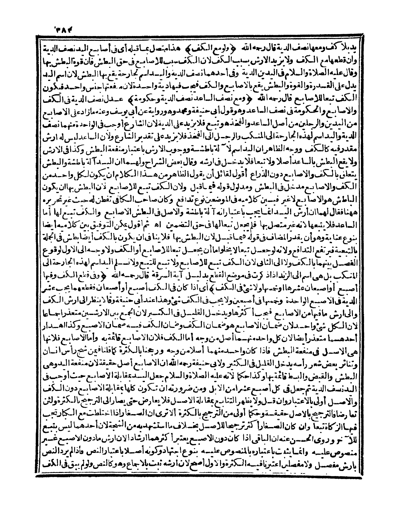 ثُمَّ أَقُولُ: يُمْكِنُ التَّوْفِيقُ بَيْنَ كَلَامَيْهِ أَيْضًا بِنَوْعِ عِنَايَةٍ وَهُوَ أَنْ يُقَدَّرَ الْمُضَافُ فِي قَوْلِهِ فِيمَا قَبْلُ؛ لِأَنَّ الْبَطْشَ بِهَا فَلَا يُنَافِي أَنْ يَكُونَ بِالْكَفِّ أَيْضًا بَطْشٌ فِي الْجُمْلَةِ بِالتَّبَعِيَّةِ فَيَرْتَفِعُ التَّدَافُعُ وَلِأَنَّهُ لَوْ جُعِلَ تَبَعًا لَا يَخْلُو إمَّا أَنْ يُجْعَلَ تَبَعًا لِلْأَصَابِعِ أَوْ الْكَفِّ وَلَا وَجْهَ إلَى الْأَوَّلِ لِوُقُوعِ الْفَصْلِ بَيْنَهُمَا بِالْكَفِّ وَلَا إلَى الثَّانِي؛ لِأَنَّ الْكَفَّ تَبَعٌ لِلْأَصَابِعِ وَلَا تَبَعَ لِلتَّبَعِ وَلَا نُسَلِّمُ الْيَدَ اسْمٌ لِهَذِهِ الْجَارِحَةِ إلَى الْمَنْكِبِ بَلْ هِيَ اسْمٌ إلَى الزَّنْدِ إذَا ذُكِرَتْ فِي مَوْضِعِ الْقَطْعِ بِدَلِيلِ آيَةِ السَّرِقَةِ.