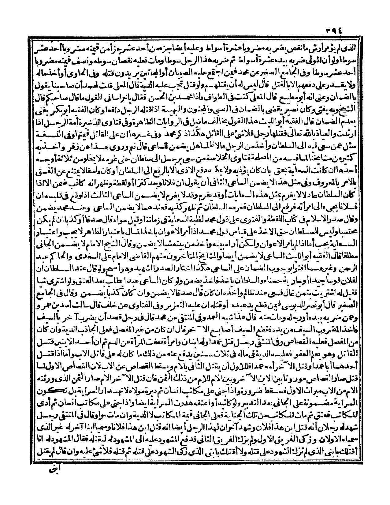 الَّذِي لَمْ يُؤْمَرْ أَرْشُ مَا نَقَصَ بِضَرْبِهِ مَضْرُوبًا عَشَرَةَ أَسْوَاطٍ وَعَلَيْهِ أَيْضًا جُزْءٌ مِنْ أَحَدَ عَشَرَ جُزْءًا مِنْ قِيمَتِهِ مَضْرُوبًا أَحَدَ عَشَرَ سَوْطًا وَلَوْ أَنَّ الْمَوْلَى ضَرَبَهُ بِيَدِهِ عَشَرَةَ أَسْوَاطٍ ثُمَّ ضَرَبَهُ هَذَا الرَّجُلُ سَوْطًا وَمَاتَ فَعَلَيْهِ نُقْصَانُ سَوْطِهِ وَنِصْفُ قِيمَتِهِ مَضْرُوبًا أَحَدَ عَشَرَ سَوْطًا وَفِي الْجَامِعِ الصَّغِيرِ عَنْ مُحَمَّدٍ فِيمَنْ اجْتَمَعَ عَلَيْهِ الصِّبْيَانُ أَوْ الْمَجَانِينُ يُرِيدُونَ قَتْلَهُ وَفِي الْحَاوِي أَوْ أَخْذَ مَالِهِ وَلَا يَقْدِرُ عَلَى دَفْعِهِمْ إلَّا بِالْقَتْلِ قَالَ لَيْسَ لَهُ أَنْ يَقْتُلَهُمْ وَلَوْ قَتَلَ تَجِبُ عَلَيْهِ الدِّيَةُ قَالَ الْمُعَلَّى قُلْتُ: لِمُحَمَّدٍ إنَّ صَاحِبَنَا يَقُولُ بِالضَّمَانِ وَعَنَى أَنَّهُ أَبُو مُطِيعٍ قَالَ الْمُعَلَّى كُنْت فِي الطَّوَافِ، فَإِذَا مُحَمَّدُ بْنُ الْحَسَنِ فَقَالَ يَا خُرَاسَانِيُّ الْقَوْلُ مَا قَالَ صَاحِبُكُمْ قَالَ الشَّيْخُ وَبِهِ يُفْتِي، وَكَانَ نُصَيْرٌ يَقْضِي بِالضَّمَانِ فِي الصَّبِيِّ وَالْمَجْنُونِ وَالْبَهِيمَةِ إذَا قَتَلَهُ الرَّجُلُ دَافِعًا وَكَانَ الْفَقِيهُ أَبُو بَكْرٍ يُفْتِي بِعَدَمِ الضَّمَانِ قَالَ الْفَقِيهُ أَبُو اللَّيْثِ هَذَا الْقَوْلُ يُخَالِفُ مَا قِيلَ فِي الرِّوَايَاتِ الظَّاهِرَةِ وَفِي فَتَاوَى الذَّخِيرَةِ أَمَةُ الرَّجُلِ إذَا ارْتَدَّتْ وَالْعِيَاذُ بِاَللَّهِ تَعَالَى فَقَتَلَهَا رَجُلٌ فَلَا شَيْءَ عَلَى الْقَاتِلِ هَكَذَا ذَكَرَ مُحَمَّدٌ وَفِي غَيْرِهَا أَنَّ عَلَى الْقَاتِلِ قِيمَتَهَا وَفِي النَّسَفِيَّةِ سُئِلَ عَمَّنْ سَعَى فِيهِ إلَى السُّلْطَانِ وَأَخَذَ مِنْ الرَّجُلِ مَالًا ظُلْمًا هَلْ يَضْمَنُ لِلسَّاعِي قَالَ نَعَمْ وَرُوِيَ هَذَا عَنْ زُفَرَ وَأَخَذَ بِهِ كَثِيرٌ مِنْ مَشَايِخِنَا لِمَا فِيهِ مِنْ الْمَصْلَحَةِ فَتَاوَى الْخُلَاصَةِ.