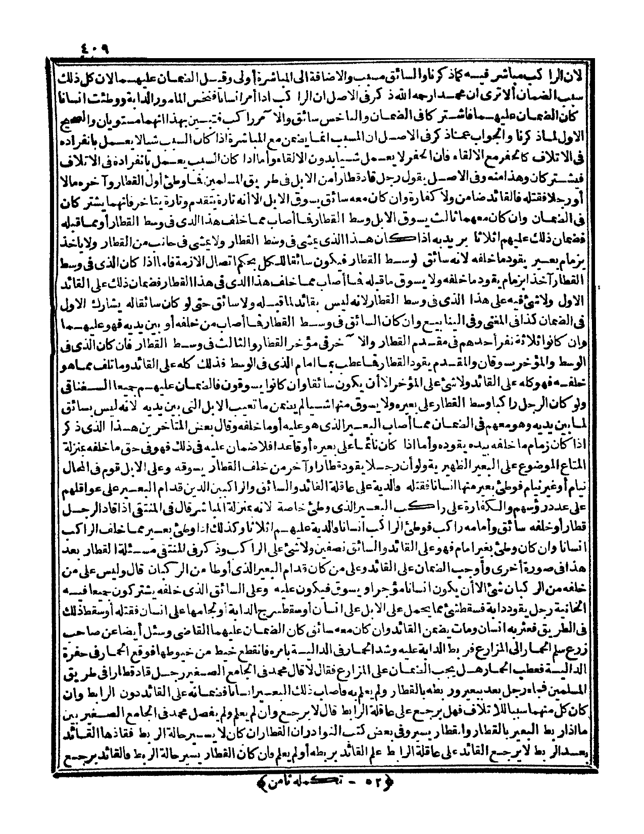 وَإِنْ كَانُوا يَسُوقُونَ فَالضَّمَانُ عَلَيْهِمْ جَمِيعًا السِّغْنَاقِيِّ وَلَوْ كَانَ الرَّجُلُ رَاكِبًا وَسَطَ الْقِطَارِ عَلَى بَعِيرِهِ وَلَا يَسُوقُ مِنْهَا شَيْئًا لَمْ يَضْمَنْ مَا تَعِيبُ الْإِبِلُ الَّتِي بَيْنَ يَدَيْهِ؛ لِأَنَّهُ لَيْسَ بِسَائِقٍ لِمَا بَيْنَ يَدَيْهِ وَهُوَ مَعَهُمْ فِي الضَّمَانِ مِمَّا أَصَابَ الْبَعِيرُ الَّذِي هُوَ عَلَيْهِ أَوْ مَا خَلْفَهُ وَقَالَ بَعْضُ الْمُتَأَخِّرِينَ هَذَا الَّذِي ذُكِرَ إذَا كَانَ زِمَامُ مَا خَلْفَهُ بِيَدِهِ يَقُودُهُ، وَأَمَّا إذَا كَانَ نَائِمًا عَلَى بَعِيرِهِ أَوْ قَاعِدًا فَلَا ضَمَانَ عَلَيْهِ فِي ذَلِكَ فَهُوَ فِي حَقِّ مَا خَلْفَهُ بِمَنْزِلَةِ الْمَتَاعِ الْمَوْضُوعِ عَلَى الْبَعِيرِ الظَّهِيرِيَّةِ وَلَوْ أَنَّ رَجُلًا يَقُودُ قِطَارًا وَآخَرُ مِنْ خَلْفِ الْقِطَارِ يَسُوقُهُ وَعَلَى الْإِبِلِ قَوْمٌ فِي الْمَحَالِّ نِيَامٌ أَوْ غَيْرُ نِيَامٍ فَوَطِئَ بَعِيرٌ مِنْهَا إنْسَانًا فَقَتَلَهُ فَالدِّيَةُ عَلَى عَاقِلَةِ الْقَائِدِ وَالسَّائِقِ وَالرَّاكِبِينَ الَّذِينَ قُدَّامَ الْبَعِيرِ عَلَى عَوَاقِلِهِمْ عَلَى عَدَدِ رُءُوسِهِمْ وَالْكَفَّارَةُ عَلَى رَاكِبِ الْبَعِيرِ الَّذِي وَطِئَ خَاصَّةً؛ لِأَنَّهُ بِمَنْزِلَةِ الْمُبَاشِرِ.