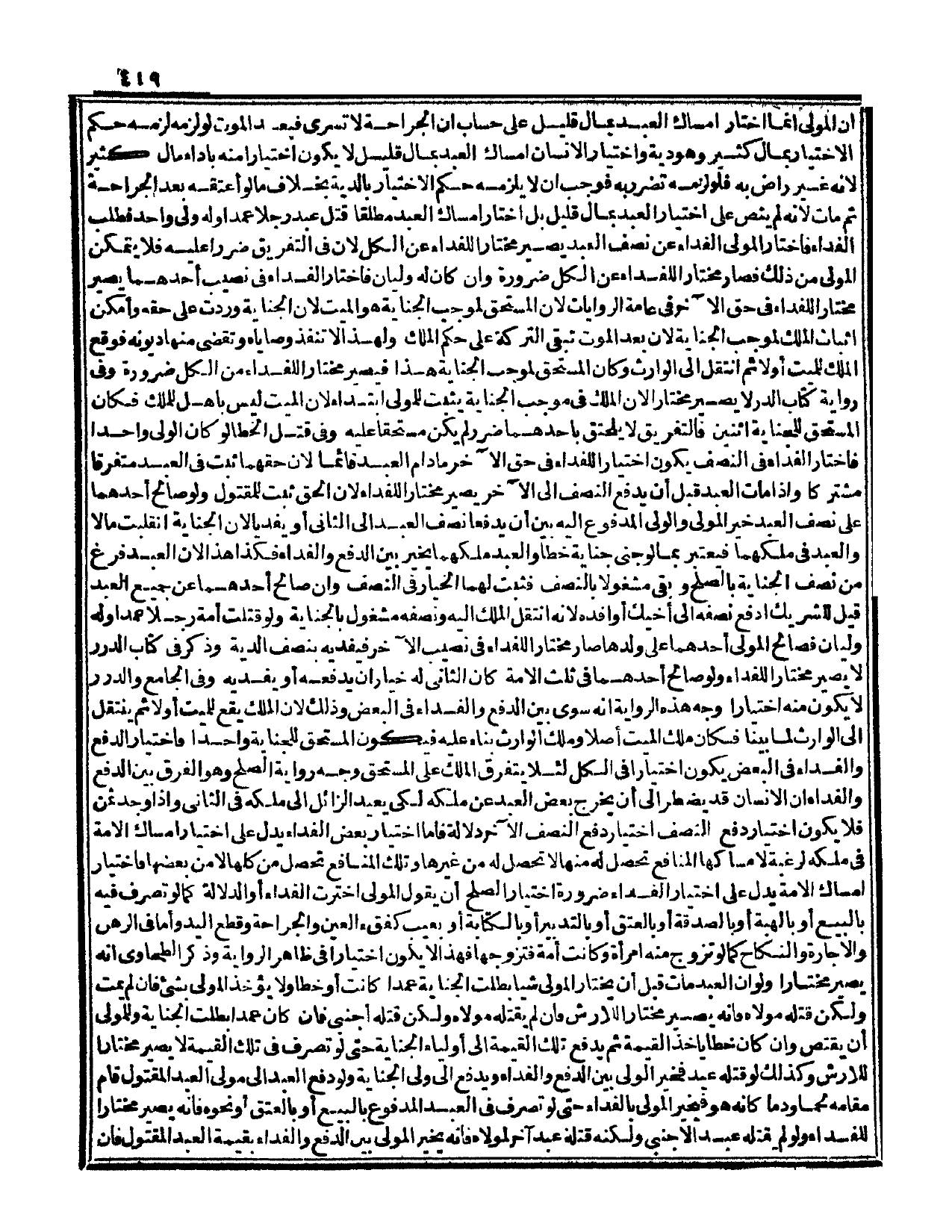 وَاخْتِيَارُ الْإِنْسَانِ إمْسَاكَ الْعَبْدِ بِمَالٍ قَلِيلٍ لَا يَكُونُ اخْتِيَارًا مِنْهُ بِأَدَاءِ مَالٍ كَثِيرِ لِأَنَّهُ غَيْرُ رَاضٍ بِهِ فَلَوْ لَزِمَهُ تَضَرَّرَ بِهِ فَوَجَبَ أَنْ لَا يَلْزَمَهُ حُكْمُ الِاخْتِيَارِ بِالدِّيَةِ بِخِلَافِ مَا لَوْ أَعْتَقَهُ بَعْدَ الْجِرَاحَةِ ثُمَّ مَاتَ لِأَنَّهُ لَمْ يَنُصَّ عَلَى اخْتِيَارِ الْعَبْدِ بِمَالٍ قَلِيلٍ بَلْ اخْتَارَ إمْسَاكَ الْعَبْدِ مُطْلَقًا قَتَلَ عَبْدٌ رَجُلًا عَمْدًا وَلَهُ وَلِيٌّ وَاحِدٌ فَطَلَبَ الْفِدَاءَ فَاخْتَارَ الْمَوْلَى الْفِدَاءَ عَنْ نِصْفِ الْعَبْدِ يَصِيرُ مُخْتَارًا لِلْفِدَاءِ عَنْ الْكُلِّ لِأَنَّ فِي التَّفْرِيقِ ضَرَرًا عَلَيْهِ فَلَا يَتَمَكَّنُ الْمَوْلَى مِنْ ذَلِكَ فَصَارَ مُخْتَارًا لِلْفِدَاءِ عَنْ الْكُلِّ ضَرُورَةً وَإِنْ كَانَ لَهُ وَلِيَّانِ فَاخْتَارَ الْفِدَاءَ فِي نَصِيبِ أَحَدِهِمَا يَصِيرُ مُخْتَارًا لِلْفِدَاءِ فِي حَقِّ الْآخَرِ فِي عَامَّةِ الرِّوَايَاتِ لِأَنَّ الْمُسْتَحِقَّ لِمُوجِبِ الْجِنَايَةِ هُوَ الْمَيِّتُ لِأَنَّ الْجِنَايَةَ وَرَدَتْ عَلَى حَقِّهِ وَأَمْكَنَ إثْبَاتُ الْمِلْكِ لِمُوجِبِ الْجِنَايَةِ لِأَنَّ بَعْدَ الْمَوْتِ تَبْقَى التَّرِكَةُ عَلَى حُكْمِ الْمِلْكِ وَلِهَذَا لَا تَنْفُذُ وَصَايَاهُ وَتُقْضَى مِنْهَا دُيُونُهُ فَوَقَعَ الْمِلْكُ لِلْمَيِّتِ أَوَّلًا ثُمَّ انْتَقَلَ إلَى الْوَارِثِ وَكَانَ الْمُسْتَحِقُّ لِمُوجِبِ الْجِنَايَةِ هَذَا فَيَصِيرُ مُخْتَارًا لِلْفِدَاءِ مِنْ الْكُلِّ ضَرُورَةً وَفِي رِوَايَةِ كِتَابِ الدُّرِّ لَا يَصِيرُ مُخْتَارًا لِأَنَّ الْمِلْكَ فِي مُوجِبِ الْجِنَايَةِ يَثْبُتُ لِلْمَوْلَى ابْتِدَاءً لِأَنَّ الْمَيِّتَ لَيْسَ بِأَهْلٍ لِلْمِلْكِ فَكَانَ الْمُسْتَحِقُّ لِلْجِنَايَةِ اثْنَيْنِ فَالتَّفْرِيقُ لَا يُلْحِقُ بِأَحَدِهِمَا ضَرَرًا لَمْ يَكُنْ مُسْتَحَقًّا عَلَيْهِ وَفِي قَتْلِ الْخَطَأِ لَوْ كَانَ الْوَلِيُّ وَاحِدًا فَاخْتَارَ الْفِدَاءَ فِي النِّصْفِ يَكُونُ اخْتِيَارًا لِلْفِدَاءِ فِي حَقِّ الْآخَرِ مَا دَامَ الْعَبْدُ قَائِمًا لِأَنَّ حَقَّهُمَا ثَبَتَ فِي الْعَبْدِ مُتَفَرِّقًا مُشْتَرَكًا.