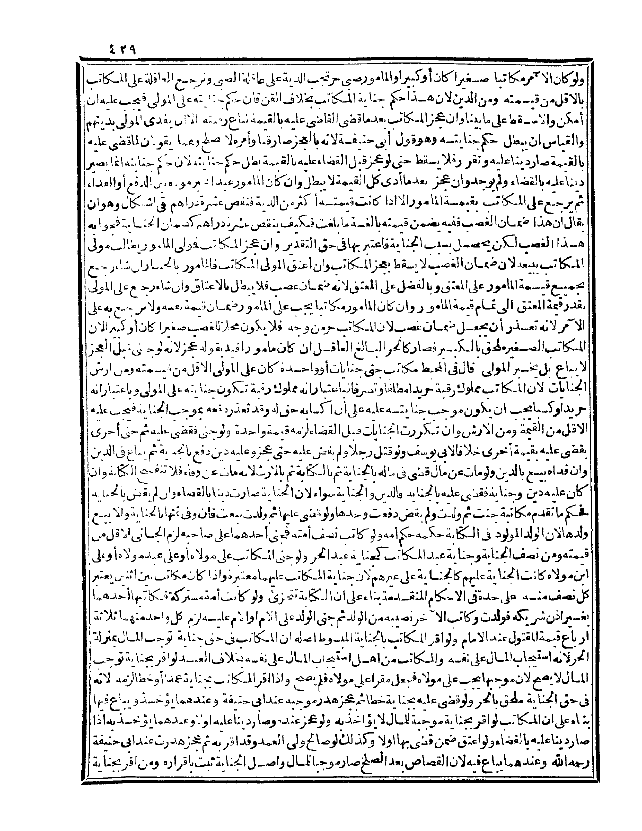 قَالَ فِي الْمُحِيطِ مُكَاتَبٌ جَنَى جِنَايَاتٍ أَوْ وَاحِدَةً كَانَ عَلَى الْمَوْلَى الْأَقَلُّ مِنْ قِيمَتِهِ وَمِنْ أَرْشِ الْجِنَايَاتِ لِأَنَّ الْمُكَاتَبَ مَمْلُوكٌ رَقَبَةً حُرٌّ يَدًا مُطْلَقًا وَتَصَرُّفًا فَبِاعْتِبَارِ أَنَّهُ مَمْلُوكٌ رَقَبَةً تَكُونُ جِنَايَتُهُ عَلَى الْمَوْلَى.