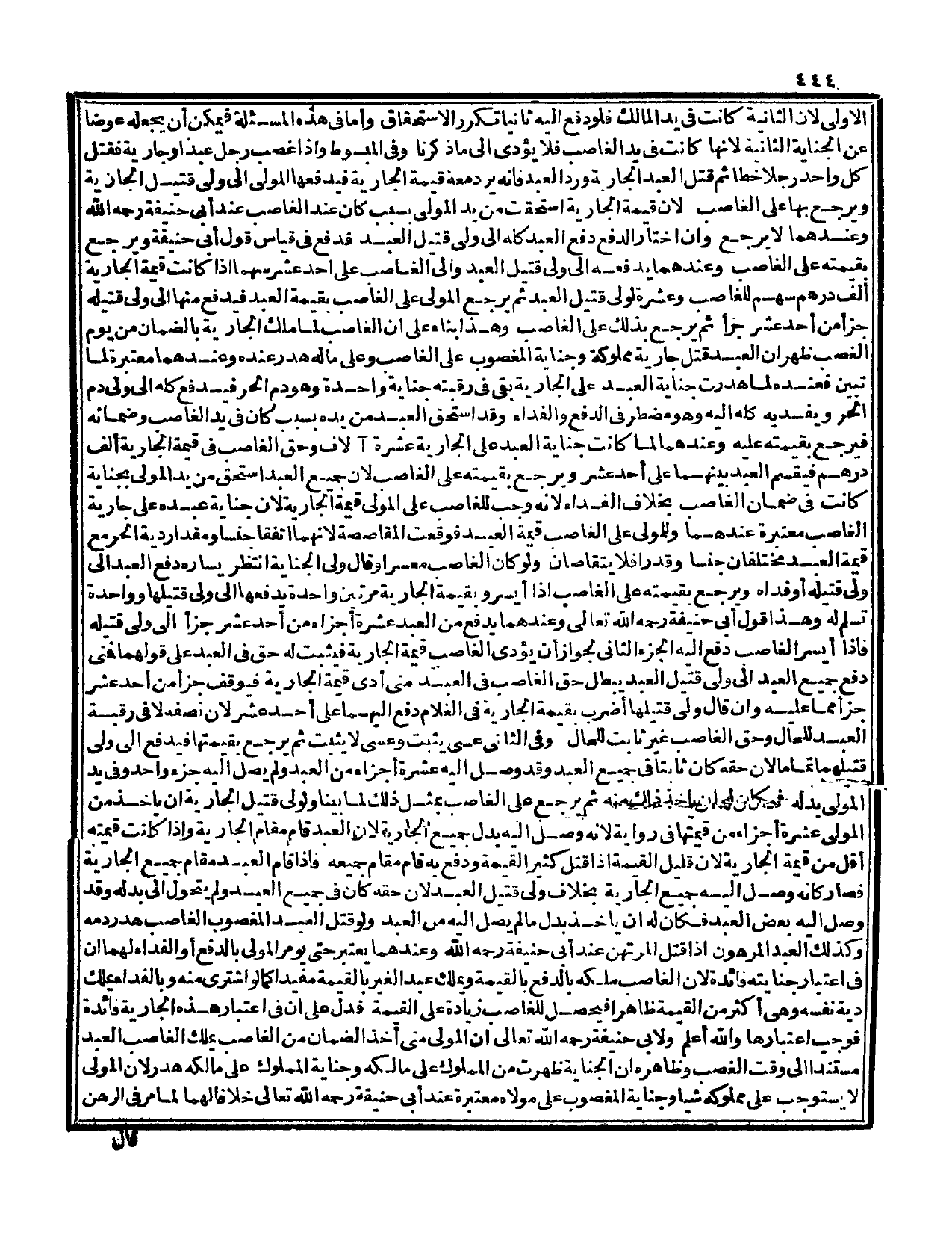 الْأُولَى لِأَنَّ الثَّانِيَةَ كَانَتْ فِي يَدِ الْمَالِكِ فَلَوْ دَفَعَ إلَيْهِ ثَانِيًا تَكَرَّرَ الِاسْتِحْقَاقُ وَأَمَّا فِي هَذِهِ الْمَسْأَلَةِ فَيُمْكِنُ أَنْ يَجْعَلَهُ عِوَضًا عَنْ الْجِنَايَةِ الثَّانِيَةِ لِأَنَّهَا كَانَتْ فِي يَدِ الْغَاصِبِ فَلَا يُؤَدِّي إلَى مَا ذَكَرْنَا وَفِي الْمَبْسُوطِ وَإِذَا غَصَبَ رَجُلٌ عَبْدًا وَجَارِيَةً فَقَتَلَ كُلُّ وَاحِدٍ رَجُلًا خَطَأً ثُمَّ قَتَلَ الْعَبْدُ الْجَارِيَةَ وَرُدَّ الْعَبْدُ فَإِنَّهُ يُرَدُّ مَعَهُ قِيمَةُ الْجَارِيَةِ فَيَدْفَعُهَا الْمَوْلَى إلَى وَلِيِّ قَتِيلِ الْجَارِيَةِ وَيَرْجِعُ بِهَا عَلَى الْغَاصِبِ لِأَنَّ قِيمَةَ الْجَارِيَةِ اُسْتُحِقَّتْ مِنْ يَدِ الْمَوْلَى بِسَبَبٍ كَانَ عِنْدَ الْغَاصِبِ عِنْدَ أَبِي حَنِيفَةَ - رَحِمَهُ اللَّهُ - وَعِنْدَهُمَا لَا يَرْجِعُ وَإِنْ اخْتَارَ الدَّفْعَ دَفَعَ الْعَبْدَ كُلَّهُ إلَى وَلِيِّ قَتِيلِ الْعَبْدِ فَدَفَعَ فِي قِيَاسِ قَوْلِ أَبِي حَنِيفَةَ وَيَرْجِعُ بِقِيمَتِهِ عَلَى الْغَاصِبِ وَعِنْدَهُمَا يَدْفَعُهُ إلَى وَلِيِّ قَتِيلِ الْعَبْدِ وَإِلَى الْغَاصِبِ عَلَى أَحَدَ عَشَرَ سَهْمًا إذَا كَانَتْ قِيمَةُ الْجَارِيَةِ أَلْفَ دِرْهَمٍ سَهْمٌ لِلْغَاصِبِ وَعَشَرَةٌ لِوَلِيِّ قَتِيلِ الْعَبْدِ ثُمَّ يَرْجِعُ الْمَوْلَى عَلَى الْغَاصِبِ بِقِيمَةِ الْعَبْدِ فَيَدْفَعُ مِنْهَا إلَى وَلِيِّ قَتِيلِهِ جُزْءًا مِنْ أَحَدَ عَشَرَ جُزْءًا ثُمَّ يَرْجِعُ بِذَلِكَ عَلَى الْغَاصِبِ وَهَذَا بِنَاءٌ عَلَى أَنَّ الْغَاصِبَ لَمَّا مَلَكَ الْجَارِيَةَ بِالضَّمَانِ مِنْ يَوْمِ الْغَصْبِ ظَهَرَ أَنَّ الْعَبْدَ قَتَلَ جَارِيَةً مَمْلُوكَةً.