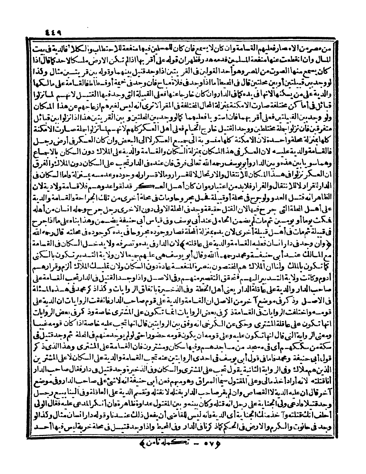 فَأَمَّا فِي قَوْلِ أَبِي يُوسُفَ فِي إحْدَى الرِّوَايَتَيْنِ عَنْهُ تَجِبُ الْقَسَامَةُ وَالدِّيَةُ عَلَى السُّكَّانِ لَا عَلَى الْمُشْتَرِينَ الَّذِينَ هُمْ مُلَّاكٌ وَفِي الرِّوَايَةِ الثَّانِيَةِ يَقُولُ تَجِبُ عَلَى الْمُشْتَرِي وَالسُّكَّانِ وَفِي الذَّخِيرَةِ وُجِدَ قَتِيلٌ فِي دَارٍ فَقَالَ صَاحِبُ الدَّارِ أَنَا قَتَلْته لِأَنَّهُ أَرَادَ أَخْذَ مَالِي وَعَلَى الْمَقْتُولِ سِيمَا السُّرَّاقِ وَهُوَ مُبْهَمٌ فَعَنْ أَبِي حَنِيفَةَ أَنَّهُ لَا شَيْءَ عَلَى صَاحِبِ الدَّارِ وَفِي مَوْضِعٍ آخَرَ قَالَ إنَّ عَلَيْهِ الدِّيَةَ لَا الْقِصَاصَ وَإِنْ لَمْ يُقِرَّ صَاحِبُ الدَّارِ بِقَتْلِهِ وَلَا نَقْتُلُهُ وَتُقْسَمُ الدِّيَةُ عَلَى الْعَاقِلَةِ وَفِي الْيَنَابِيعِ رَجُلٌ وَجَدَ قَتِيلًا فَادَّعَى وَلِيُّ الْجِنَايَةِ عَلَى رَجُلٍ أَنَّهُ قَتَلَهُ وَكَانَ بَيْنَهُ وَبَيْنَ الْمَقْتُولِ عَدَاوَةٌ ظَاهِرَةٌ فَإِنْ أَنْكَرَ الْمُدَّعَى عَلَيْهِ فَقَالَ الْوَلِيُّ احْلِفْ أَنَّك قَتَلْته وَآخُذُ مِنْك الْجِنَايَةَ أَيْ الدِّيَةَ فَإِنَّهُ لَيْسَ لِلْقَاضِي أَنْ يَفْعَلَ ذَلِكَ عِنْدَنَا وَقَوْلُهُ دَارُ إنْسَانٍ مِثَالٌ وَكَذَا لَوْ وُجِدَ فِي حَانُوتٍ، وَالْكَرْمُ وَالْأَرْضُ فِي الْحُكْمِ كَمَا ذَكَرْنَا فِي الدَّارِ، وَفِي الْمُحِيطِ وَإِذَا وُجِدَ قَتِيلٌ فِي مَحَلَّةٍ خَرِبَةٍ لَيْسَ فِيهَا أَحَدٌ