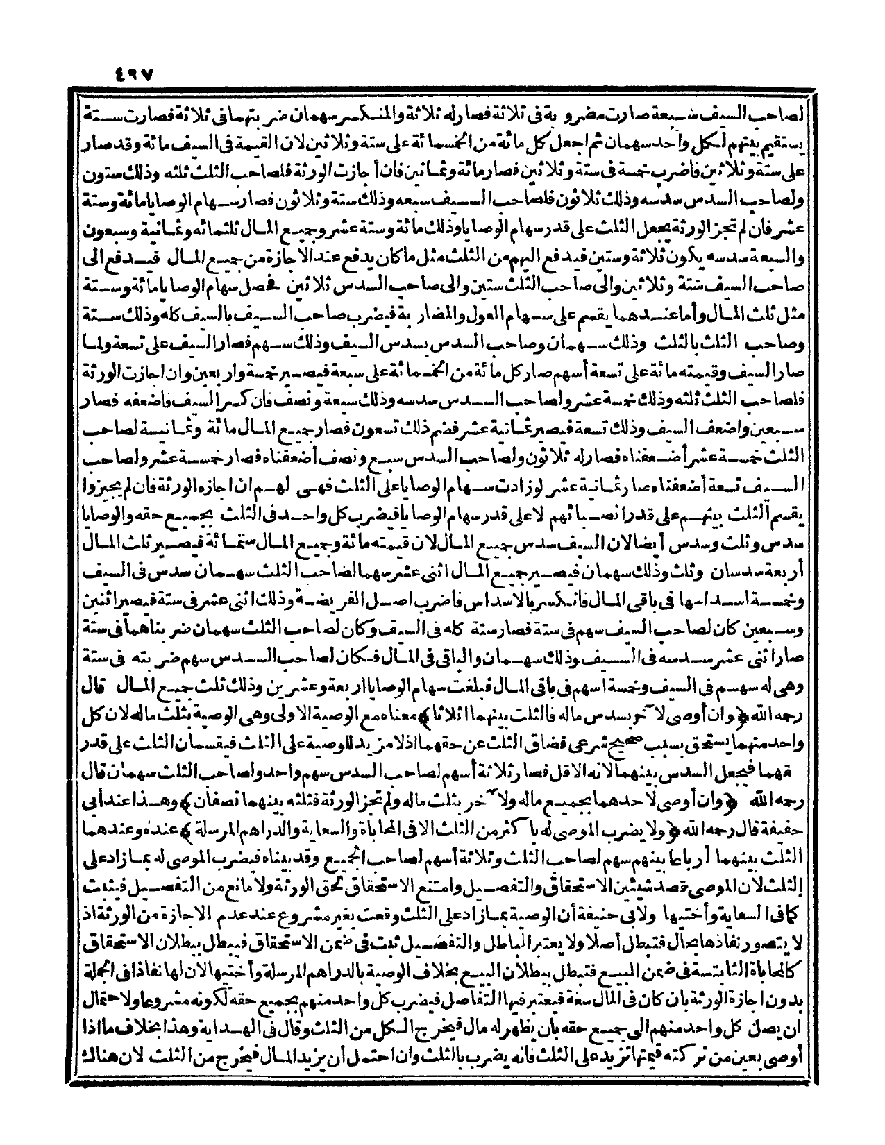 وَصَاحِبُ السُّدُسِ بِسُدُسِ السَّيْفِ، وَذَلِكَ سَهْمٌ فَصَارَ السَّيْفُ عَلَى تِسْعَةٍ، وَلَمَّا صَارَ السَّيْفُ وَقِيمَتُهُ مِائَةً عَلَى تِسْعَةِ أَسْهُمٍ صَارَ كُلُّ مِائَةٍ مِنْ الْخَمْسِمِائَةِ عَلَى سَبْعَةٍ فَيَصِيرُ خَمْسَةً وَأَرْبَعِينَ، وَإِنْ أَجَازَتْ الْوَرَثَةُ فَلِصَاحِبِ الثُّلُثِ ثُلُثُهُ، وَذَلِكَ خَمْسَةَ عَشَرَ، وَلِصَاحِبِ السُّدُسِ سُدُسُهُ، وَذَلِكَ سَبْعَةٌ وَنِصْفٌ فَإِنْ كَسَرَ السَّيْفَ فَأَضْعَفَهُ فَصَارَ سَبْعِينَ، وَأَضْعَفَ السَّيْفَ، وَذَلِكَ تِسْعَةٌ فَيَصِيرُ ثَمَانِيَةَ عَشَرَ فَضَمُّ ذَلِكَ تِسْعُونَ فَصَارَ جَمِيعُ الْمَالِ مِائَةً وَثَمَانِيَةً لِصَاحِبِ الثُّلُثِ خَمْسَةَ عَشَرَ أَضْعَفْنَاهُ فَصَارَ لَهُ ثَلَاثُونَ، وَلِصَاحِبِ السُّدُسِ سَبْعٌ وَنِصْفٌ أَضْعَفْنَاهُ فَصَارَ خَمْسَةَ عَشَرَ، وَلِصَاحِبِ السَّيْفِ تِسْعَةٌ أَضْعَفْنَاهُ صَارَ ثَمَانِيَةَ عَشَرَ لَوْ زَادَتْ سِهَامُ الْوَصَايَا عَلَى الثُّلُثِ فَهِيَ لَهُمْ إنْ أَجَازَهُ الْوَرَثَةُ فَإِنْ لَمْ يُجِيزُوا يُقْسَمُ الثُّلُثُ بَيْنَهُمْ عَلَى قَدْرِ أَنْصِبَائِهِمْ لَا عَلَى قَدْرِ سِهَامِ الْوَصَايَا فَيَضْرِبُ كُلُّ وَاحِدٍ فِي الثُّلُثِ بِجَمِيعِ حَقِّهِ، وَالْوَصَايَا سُدُسٌ وَثُلُثٌ، وَسُدُسٌ أَيْضًا لِأَنَّ السَّيْفَ سُدُسُ جَمِيعِ الْمَالِ لِأَنَّ قِيمَتَهُ مِائَةٌ، وَجَمِيعُ الْمَالِ سِتُّمِائَةٍ فَيَصِيرُ ثُلُثُ الْمَالِ أَرْبَعَةً سُدُسَانِ وَثُلُثٌ، وَذَلِكَ سَهْمَانِ فَيَصِيرُ جَمِيعُ الْمَالِ اثْنَيْ عَشَرَ سَهْمًا لِصَاحِبِ الثُّلُثِ سَهْمَانِ سُدُسٌ فِي السَّيْفِ، وَخَمْسَةُ أَسْدَاسِهَا فِي بَاقِي الْمَالِ فَانْكَسَرَ بِالْأَسْدَاسِ فَاضْرِبْ أَصْلَ الْفَرِيضَةِ، وَذَلِكَ اثْنَيْ عَشَرَ فِي سِتَّةٍ فَيَصِيرُ اثْنَيْنِ وَسَبْعِينَ كَانَ لِصَاحِبِ السَّيْفِ سَهْمٌ فِي سِتَّةٍ فَصَارَ سِتَّةً كُلُّهُ فِي السَّيْفِ، وَكَانَ لِصَاحِبِ الثُّلُثِ سَهْمَانِ ضَرَبْنَاهُمَا فِي سِتَّةٍ صَارَ اثْنَيْ عَشَرَ سُدُسُهُ فِي السَّيْفِ، وَذَلِكَ سَهْمَانِ، وَالْبَاقِي فِي الْمَالِ فَكَانَ لِصَاحِبِ السُّدُسِ سَهْمٌ ضَرَبْته فِي سِتَّةٍ.