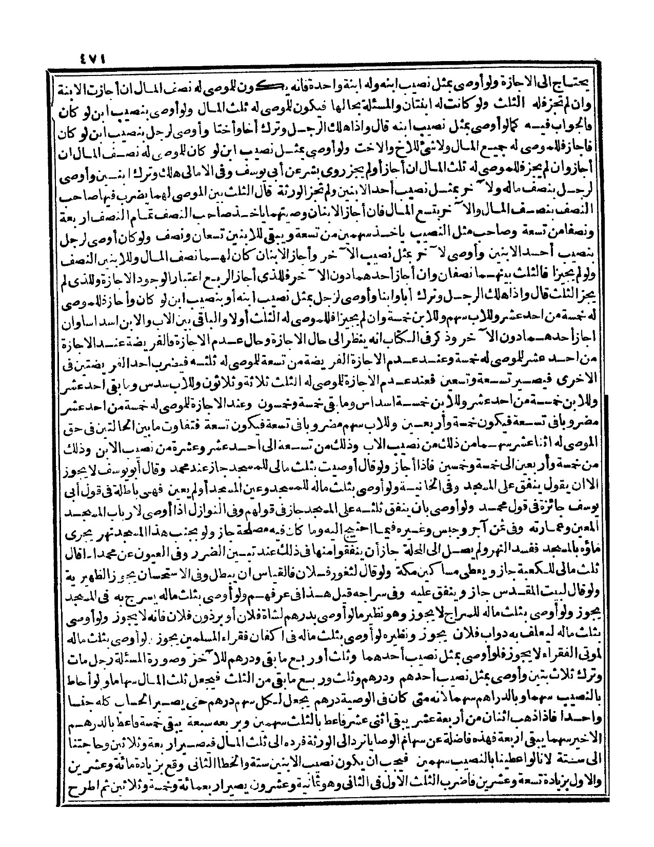وَذَلِكَ مِنْ تِسْعَةٍ إلَى أَحَدَ عَشَرَ وَعَشَرَةٍ مِنْ نَصِيبِ الِابْنِ، وَذَلِكَ مِنْ خَمْسَةٍ وَأَرْبَعِينَ إلَى خَمْسَةٍ وَخَمْسِينَ فَإِذَا أَجَازَ، وَلَوْ قَالَ أَوْصَيْت بِثُلُثِ مَالِي لِلْمَسْجِدِ جَازَ عِنْدَ مُحَمَّدٍ، وَقَالَ أَبُو يُوسُفَ لَا يَجُوزُ إلَّا أَنْ يَقُولَ يُنْفَقُ عَلَى الْمَسْجِدِ، وَفِي الْخَانِيَّةِ، وَلَوْ أَوْصَى بِثُلُثِ مَالِهِ لِلْمَسْجِدِ عَيَّنَ الْمَسْجِدَ أَوْ لَمْ يُعَيِّنْ فَهِيَ بَاطِلَةٌ فِي قَوْلِ أَبِي يُوسُفَ جَائِزَةٌ فِي قَوْلِ مُحَمَّدٍ، وَلَوْ أَوْصَى بِأَنْ يُنْفَقَ ثُلُثُهُ عَلَى الْمَسْجِدِ جَازَ فِي قَوْلِهِمْ، وَفِي النَّوَازِلِ إذَا أَوْصَى لِأَرْبَابِ الْمَسْجِدِ الْمُعَيَّنِ، وَعِمَارَتِهِ، وَفِي ثَمَنِ آجُرٍّ وَجِبْسٍ وَغَيْرِهِ فِيمَا اُحْتِيجَ إلَيْهِ وَمَا كَانَ فِيهِ مَصْلَحَةٌ جَازَ، وَلَوْ بِجَنْبِ هَذَا الْمَسْجِدِ نَهْرٌ يَجْرِي مَاؤُهُ بِالْمَسْجِدِ فَفَسَدَ النَّهْرُ، وَلَمْ يَصِلْ إلَى الْمَحَلَّةِ جَازَ أَنْ يُنْفِقُوا مِنْهَا فِي ذَلِكَ عِنْدَ تَبَيُّنِ الضَّرَرِ، وَفِي الْعُيُونِ عَنْ مُحَمَّدٍ إذَا قَالَ ثُلُثُ مَالِي لِلْكَعْبَةِ جَازَ، وَيُعْطَى مَسَاكِينُ مَكَّةَ، وَلَوْ قَالَ لِثُغُورِ فُلَانٍ فَالْقِيَاسُ أَنْ يَبْطُلَ، وَفِي الِاسْتِحْسَانِ يَجُوزُ الظَّهِيرِيَّةُ، وَلَوْ قَالَ لِبَيْتِ الْمَقْدِسِ جَازَ، وَيُنْفَقُ عَلَيْهِ، وَفِي سِرَاجِهِ قِيلَ هَذَا فِي عُرْفِهِمْ، وَلَوْ أَوْصَى بِثُلُثِ مَالِهِ يُسْرَجُ بِهِ فِي الْمَسْجِدِ يَجُوزُ، وَلَوْ أَوْصَى بِثُلُثِ مَالِهِ لِلسِّرَاجِ لَا يَجُوزُ، وَهُوَ نَظِيرُ مَا لَوْ أَوْصَى بِدِرْهَمٍ لِشَاةِ فُلَانٍ أَوْ بِرْذَوْنِ فُلَانٍ فَإِنَّهُ لَا يَجُوزُ، وَلَوْ أَوْصَى بِثُلُثِ مَالِهِ لِيُعْلَفَ بِهِ دَوَابُّ فُلَانٍ يَجُوزُ، وَنَظِيرُهُ لَوْ أَوْصَى بِثُلُثِ مَالِهِ فِي أَكْفَانِ فُقَرَاءِ الْمُسْلِمِينَ يَجُوزُ.