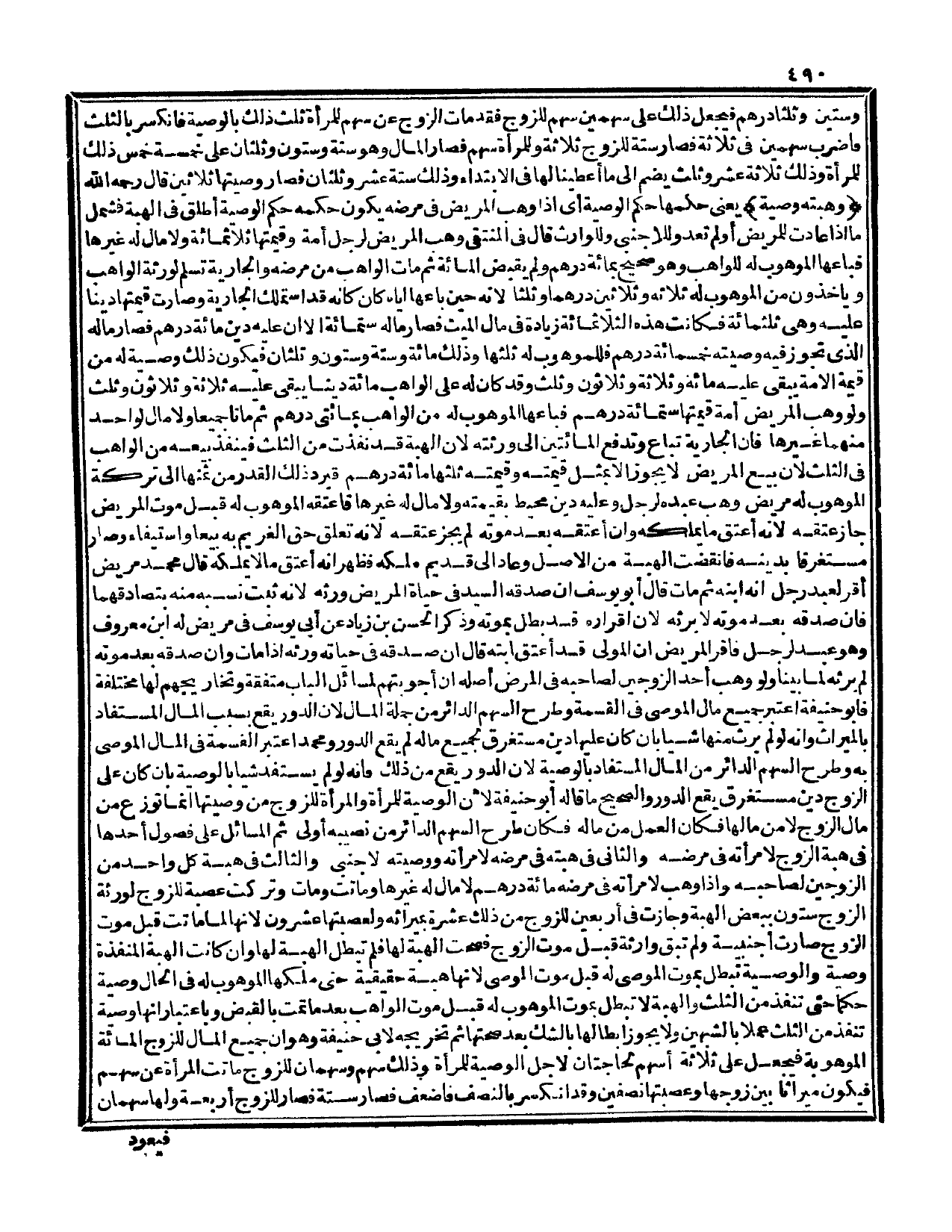 ثُمَّ الْمَسَائِلُ عَلَى فُصُولٍ أَحَدُهَا فِي هِبَةِ الزَّوْجِ لِامْرَأَتِهِ فِي مَرَضِهِ، وَالثَّانِي فِي هِبَتِهِ فِي مَرَضِهِ لِامْرَأَتِهِ وَوَصِيَّتِهِ لِأَجْنَبِيٍّ، وَالثَّالِثُ فِي هِبَةِ كُلِّ وَاحِدٍ مِنْ الزَّوْجَيْنِ لِصَاحِبِهِ، وَإِذَا وَهَبَ لِامْرَأَتِهِ فِي مَرَضِهِ مِائَةَ دِرْهَمٍ لَا مَالَ لَهُ غَيْرُهَا وَمَاتَتْ وَمَاتَ، وَتَرَكَتْ عَصَبَةً لِلزَّوْجِ لِوَرَثَةِ الزَّوْجِ سِتُّونَ بِبَعْضِ الْهِبَةِ، وَجَازَتْ فِي أَرْبَعِينَ لِلزَّوْجِ مِنْ ذَلِكَ عَشْرَةٌ بِمِيرَاثِهِ، وَلِعَصَبَتِهَا عِشْرُونَ لِأَنَّهَا لَمَّا مَاتَتْ قَبْلَ مَوْتِ الزَّوْجِ صَارَتْ أَجْنَبِيَّةً، وَلَمْ تَبْقَ وَارِثَةً قَبْلَ مَوْتِ الزَّوْجِ فَصَحَّتْ الْهِبَةُ لَهَا فَلَمْ تَبْطُلْ الْهِبَةُ لَهَا، وَإِنْ كَانَتْ الْهِبَةُ الْمُنَفَّذَةُ وَصِيَّةً وَالْوَصِيَّةُ تَبْطُلُ بِمَوْتِ الْمُوصَى لَهُ قَبْلَ مَوْتِ الْمُوصِي لِأَنَّهَا هِبَةٌ حَقِيقِيَّةٌ حَتَّى مَلَكَهَا الْمَوْهُوبُ لَهُ فِي الْحَالِ وَصِيَّةً حُكْمًا حَتَّى تَنْفُذَ مِنْ الثُّلُثِ.