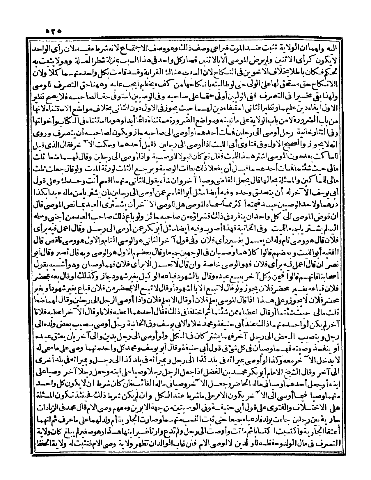 وَكَذَا لَوْ أَوْصَى بِمِيرَاثِهِ فِي بَلَدِ كَذَا إلَى رَجُلٍ وَبِمِيرَاثِهِ فِي بَلَدِ كَذَا إلَى رَجُلٍ وَبِمِيرَاثِهِ فِي بَلَدٍ أُخْرَى إلَى آخَرَ، وَقَالَ الشَّيْخُ الْإِمَامُ أَبُو بَكْرٍ مُحَمَّدُ بْنُ الْفَضْلِ إذَا جَعَلَ الرَّجُلُ رَجُلًا وَصِيًّا عَلَى ابْنِهِ وَجَعَلَ رَجُلًا آخَرَ وَصِيًّا عَلَى ابْنِهِ أَوْ جَعَلَ أَحَدَهُمَا وَصِيًّا فِي مَالِهِ الْحَاضِرِ وَجَعَلَ الْآخَرَ وَصِيًّا فِي مَالِهِ الْغَائِبِ فَإِنْ كَانَ شَرَطَ أَنْ لَا يَكُونَ كُلُّ وَاحِدٍ مِنْهُمَا وَصِيًّا فِيمَا أَوْصَى إلَى الْآخَرِ يَكُونُ الْأَمْرُ عَلَى مَا شَرَطَ عِنْدَ الْكُلِّ، وَإِنْ لَمْ يَكُنْ شَرَطَ ذَلِكَ فَحِينَئِذٍ تَكُونُ الْمَسْأَلَةُ عَلَى الِاخْتِلَافِ، وَالْفَتْوَى عَلَى قَوْلِ أَبِي حَنِيفَةَ، وَفِي الْوَصِيَّتَيْنِ مِنْ جِهَةِ الْأَبَوَيْنِ، وَمَعَهُمْ وَصِيُّ الْأُمِّ قَالَ مُحَمَّدٌ فِي الزِّيَادَاتِ: جَارِيَةٌ بَيْنَ رَجُلَيْنِ جَاءَتْ بِوَلَدٍ فَادَّعَيَاهُ جَمِيعًا حَتَّى ثَبَتَ النَّسَبُ مِنْهُمَا وَصَارَتْ الْجَارِيَةُ أُمَّ وَلَدٍ لَهُمَا عَلَى مَا عُرِفَ ثُمَّ أَنَّهُمَا أَعْتَقَا الْجَارِيَةَ وَاكْتَسَبَتْ اكْتِسَابًا ثُمَّ مَاتَتْ وَأَوْصَتْ إلَى رَجُلٍ وَلَمْ تَدَعْ وَارِثًا غَيْرَ ابْنِهَا هَذَا وَهُوَ صَغِيرٌ لَمْ يَبْلُغْ كَانَ وِلَايَةُ التَّصَرُّفِ فِي مَالِ الْوَلَدِ وَحِفْظُهُ لِلْوَلَدَيْنِ لَا لِوَصِيِّ الْأُمِّ فَإِنْ غَابَ الْوَالِدَانِ تَظْهَرُ وِلَايَةُ وَصِيِّ الْأُمِّ فَتَثْبُتُ لَهُ وِلَايَةُ الْحِفْظِ