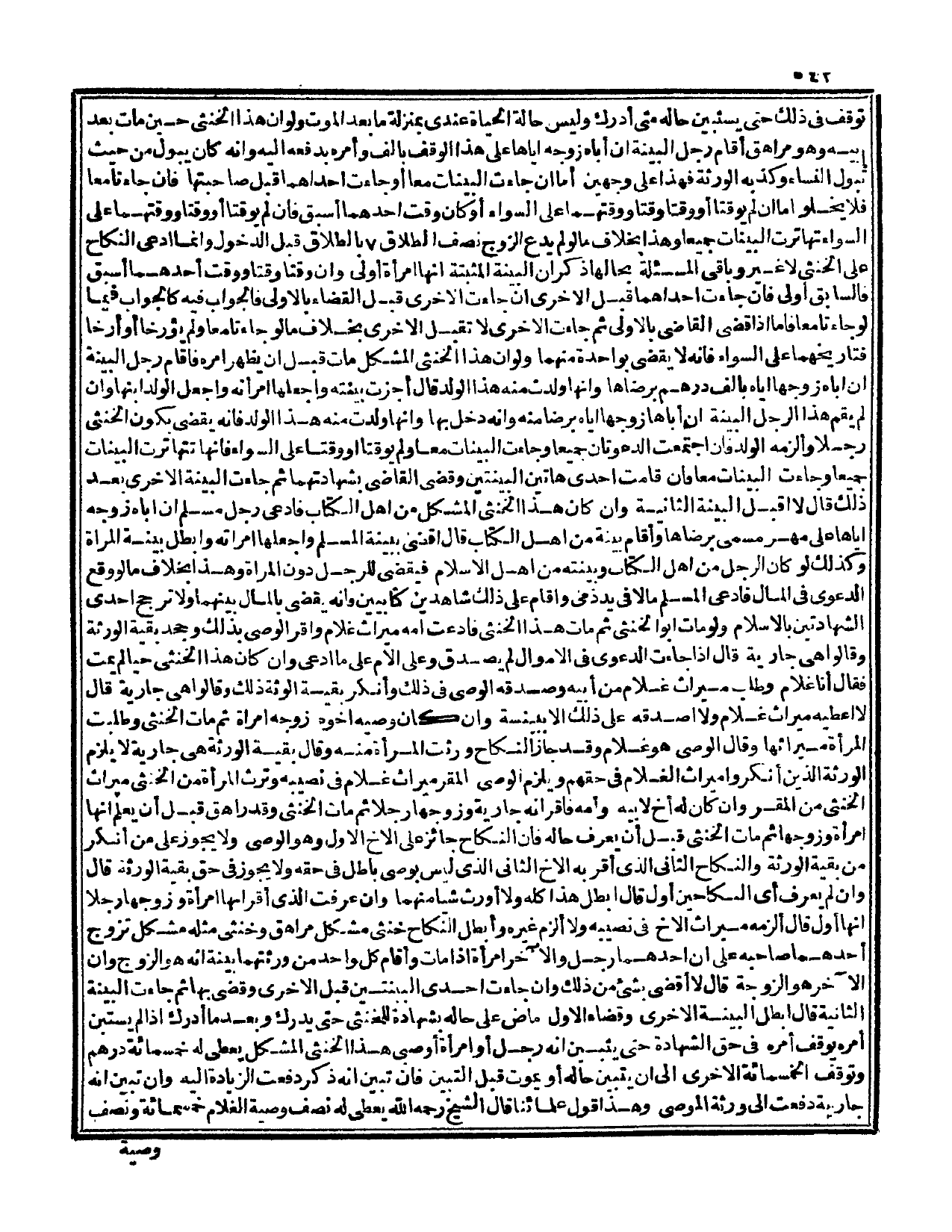 وَإِنْ كَانَ لَهُ أَخٌ لِأَبِيهِ وَأُمِّهِ فَأَقَرَّ أَنَّهُ جَارِيَةٌ وَزَوَّجَهَا رَجُلًا ثُمَّ مَاتَ الْخُنْثَى، وَقَدْ رَاهَقَ قَبْلَ أَنْ يَعْلَمَ أَنَّهَا امْرَأَةٌ وَزَوَّجَهَا ثُمَّ مَاتَ الْخُنْثَى قَبْلَ أَنْ يُعْرَفَ حَالُهُ فَإِنَّ النِّكَاحُ جَائِزٌ عَلَى الْأَخِ الْأَوَّلِ وَهُوَ الْوَصِيُّ وَلَا يَجُوزُ عَلَى مَنْ أَنْكَرَ مِنْ بَقِيَّةِ الْوَرَثَةِ، وَالنِّكَاحُ الثَّانِي الَّذِي أَقَرَّ بِهِ الْأَخُ الثَّانِي الَّذِي لَيْسَ بِوَصِيٍّ بَاطِلٌ فِي حَقِّهِ وَلَا يَجُوزُ فِي حَقِّ بَقِيَّةِ الْوَرَثَةِ، قَالَ: وَإِنْ لَمْ يُعْرَفْ أَيُّ النِّكَاحَيْنِ أَوَّلُ قَالَ أُبْطِلُ هَذَا كُلُّهُ وَلَا أُوَرِّثُ شَيْئًا مِنْهُمَا وَإِنْ عَرَفْت الَّذِي أَقَرَّ أَنَّهَا امْرَأَةٌ وَزَوَّجَهَا رَجُلًا أَنَّهَا أَوَّلُ قَالَ: أُلْزِمُهُ مِيرَاثَ الْأَخِ فِي نَصِيبِهِ وَلَا أُلْزِمُ غَيْرَهُ وَأُبْطِلُ النِّكَاحَ خُنْثَى مُشْكِلٌ مُرَاهِقٌ وَخُنْثَى مِثْلُهُ مُشْكِلٌ تَزَوَّجَ أَحَدُهُمَا صَاحِبَهُ عَلَى أَنَّ أَحَدَهُمَا رَجُلٌ، وَالْآخَرَ امْرَأَةٌ إذَا مَاتَ وَأَقَامَ كُلُّ وَاحِدٍ مِنْ وَرَثَتِهِمَا بَيِّنَةً أَنَّهُ هُوَ الزَّوْجُ وَأَنَّ الْآخَرَ هُوَ الزَّوْجَةُ قَالَ لَا أَقْضِي بِشَيْءٍ مِنْ ذَلِكَ وَإِنْ جَاءَتْ إحْدَى الْبَيِّنَتَيْنِ قَبْلَ الْأُخْرَى وَقَضَى بِهَا ثُمَّ جَاءَتْ الْبَيِّنَةُ الثَّانِيَةُ قَالَ أُبْطِلُ الْبَيِّنَةَ الْأُخْرَى وَقَضَاءُ الْأَوَّلِ مَاضٍ عَلَى حَالِهِ بِشَهَادَةِ لِلْخُنْثَى حَتَّى يُدْرِكَ وَبَعْدَمَا أَدْرَكَ إذَا لَمْ يَسْتَبِنْ أَمْرُهُ يُوقَفُ أَمْرُهُ فِي حَقِّ الشَّهَادَةِ حَتَّى يَتَبَيَّنَ أَنَّهُ رَجُلٌ أَوْ امْرَأَةٌ أَوْ صَبِيٌّ هَذَا الْخُنْثَى الْمُشْكِلُ يُعْطِي لَهُ خَمْسَمِائَةِ دِرْهَمٍ وَتُوقَفُ الْخَمْسُمِائَةِ الْأُخْرَى إلَى أَنْ يَتَبَيَّنَ حَالُهُ أَوْ يَمُوتُ قَبْلَ التَّبَيُّنِ فَإِنْ تَبَيَّنَ أَنَّهُ ذَكَرَ دُفِعَتْ الزِّيَادَةُ إلَيْهِ وَإِنْ تَبَيَّنَ أَنَّهُ جَارِيَةٌ دُفِعَتْ إلَى وَرَثَةِ الْمُوصِي وَهَذَا قَوْلُ عُلَمَائِنَا قَالَ الشَّيْخُ - رَحِمَهُ اللَّهُ -: يُعْطِي لَهُ نِصْفَ وَصِيَّةِ الْغُلَامِ خَمْسَمِائَةٍ وَنِصْفَ