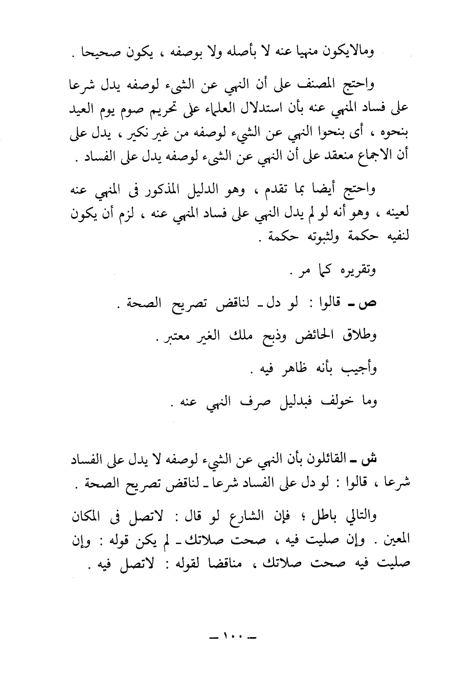 ش - الْقَائِلُونَ بِأَنَّ النَّهْيَ عَنِ الشَّيْءِ لِوَصْفِهِ لَا يَدُلُّ عَلَى الْفَسَادِ شَرْعًا، قَالُوا: لَوْ دَلَّ عَلَى الْفَسَادِ شَرْعًا لَنَاقَضَ تَصْرِيحَ الصِّحَّةِ. وَالتَّالِي بَاطِلٌ، فَإِنَّ الشَّارِعَ لَوْ قَالَ: لَا تُصَلِّ فِي الْمَكَانِ الْمُعَيَّنِ، وَإِنْ صَلَّيْتَ فِيهِ، صَحَّتْ صَلَاتُكَ - لَمْ يَكُنْ قَوْلُهُ: وَإِنْ صَلَّيْتَ فِيهِ صَحَّتْ صَلَاتُكَ، مُنَاقِضًا لِقَوْلِهِ: لَا تُصَلِّ فِيهِ.