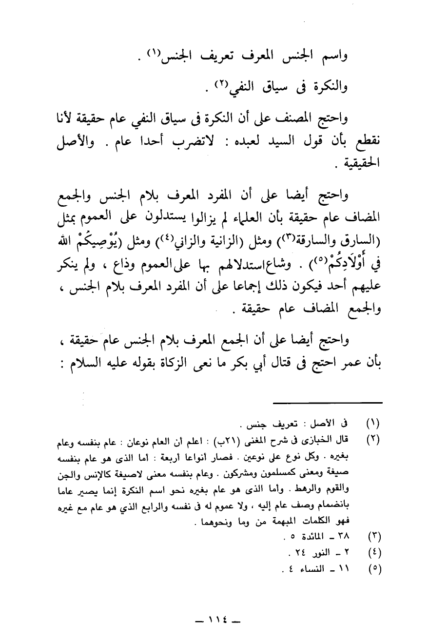 وَاحْتُجَّ أَيْضًا عَلَى أَنَّ الْمُفْرَدَ الْمُعَرَّفَ بِلَامِ الْجِنْسِ وَالْجَمْعَ الْمُضَافَ عَامٌّ حَقِيقَةً بِأَنَّ الْعُلَمَاءَ لَمْ يَزَالُوا يَسْتَدِلُّونَ عَلَى الْعُمُومِ بِمِثْلِ (السَّارِقُ وَالسَّارِقَةُ) وَمِثْلِ (الزَّانِيَةُ وَالزَّانِي) وَمِثْلِ (يُوصِيكُمُ اللَّهُ فِي أَوْلَادِكُمْ) . وَشَاعَ اسْتِدْلَالُهُمْ بِهَا عَلَى الْعُمُومِ وَذَاعَ، وَلَمْ يُنْكِرْ عَلَيْهِمْ أَحَدٌ فَيَكُونُ ذَلِكَ إِجْمَاعًا عَلَى أَنَّ الْمُفْرَدَ الْمُعَرَّفَ بِلَامِ الْجِنْسِ، وَالْجَمْعَ الْمُضَافَ عَامٌّ حَقِيقَةً.