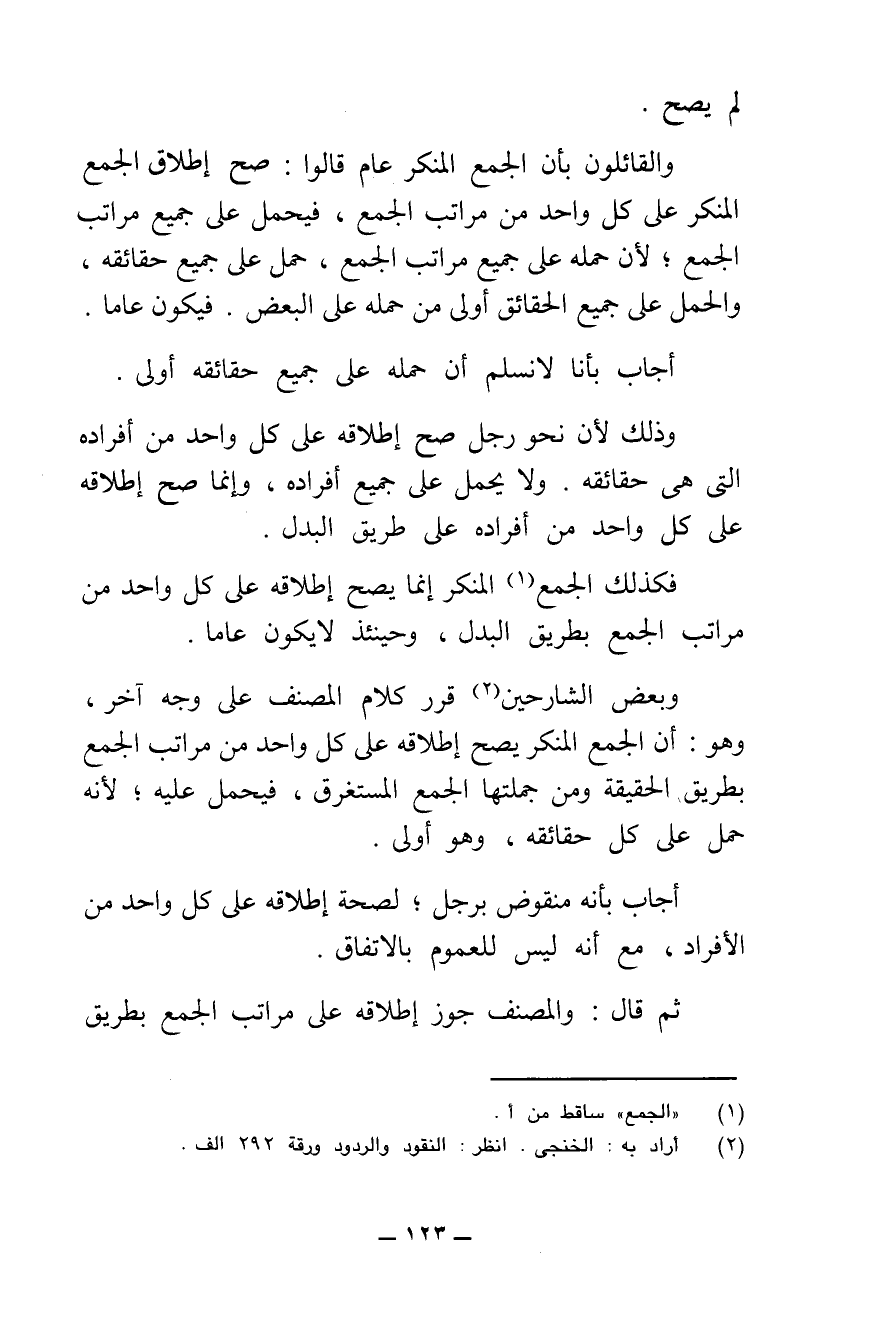 فَكَذَلِكَ الْجَمْعُ الْمُنَكَّرُ إِنَّمَا يَصِحُّ إِطْلَاقُهُ عَلَى كُلِّ وَاحِدٍ مِنْ مَرَاتِبِ الْجَمْعِ بِطَرِيقِ الْبَدَلِ، وَحِينَئِذٍ لَا يَكُونُ عَامًّا.