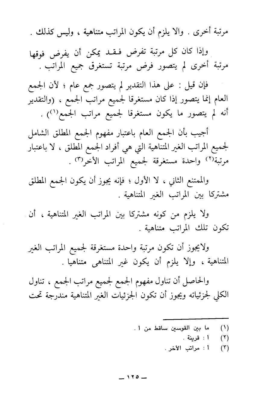 وَالْحَاصِلُ أَنَّ تَنَاوُلَ مَفْهُومِ الْجَمْعِ لِجَمِيعِ مَرَاتِبِ الْجَمْعِ، تَنَاوُلُ الْكُلِّيِّ لِجُزْئِيَّاتِهِ وَيَجُوزُ أَنْ تَكُونَ الْجُزْئِيَّاتُ الْغَيْرِ الْمُتَنَاهِيَةِ مُنْدَرِجَةً تَحْتَ