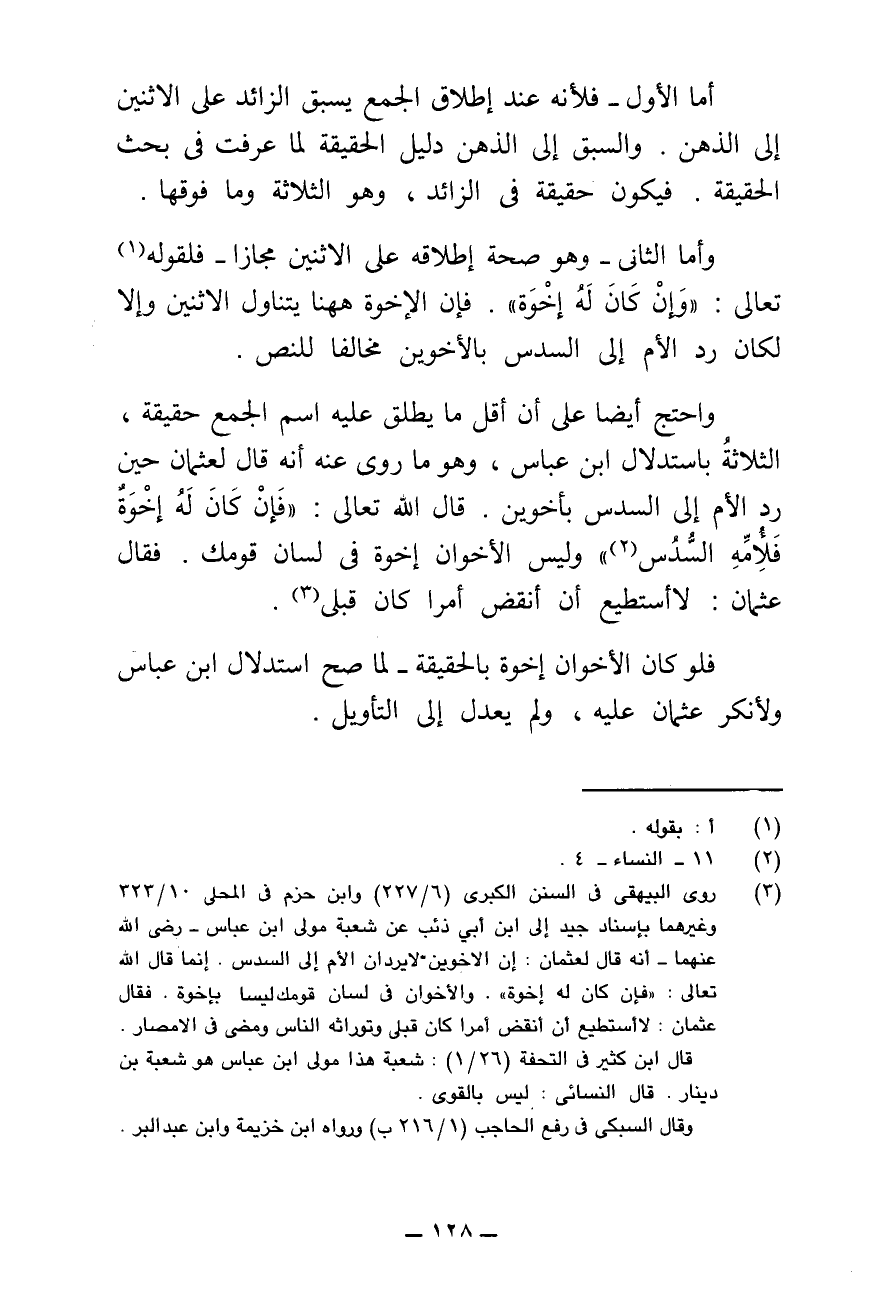 وَاحْتُجَّ أَيْضًا عَلَى أَنَّ أَقَلَّ مَا يُطْلَقُ عَلَيْهِ اسْمُ الْجَمْعِ حَقِيقَةً الثَّلَاثَةُ بِاسْتِدْلَالِ ابْنِ عَبَّاسٍ، وَهُوَ مَا رُوِيَ عَنْهُ أَنَّهُ قَالَ لِعُثْمَانَ حِينَ رَدَّ الْأُمَّ إِلَى السُّدُسِ بِأَخَوَيْنِ، قَالَ اللَّهُ تَعَالَى: {فَإِنْ كَانَ لَهُ إِخْوَةٌ فَلِأُمِّهِ السُّدُسُ} [النساء: ١١] وَلَيْسَ الْأَخَوَانِ إِخْوَةً فِي لِسَانِ قَوْمِكَ. فَقَالَ عُثْمَانُ: لَا أَسْتَطِيعُ أَنْ أَنْقُضَ أَمْرًا كَانَ قَبْلِي.