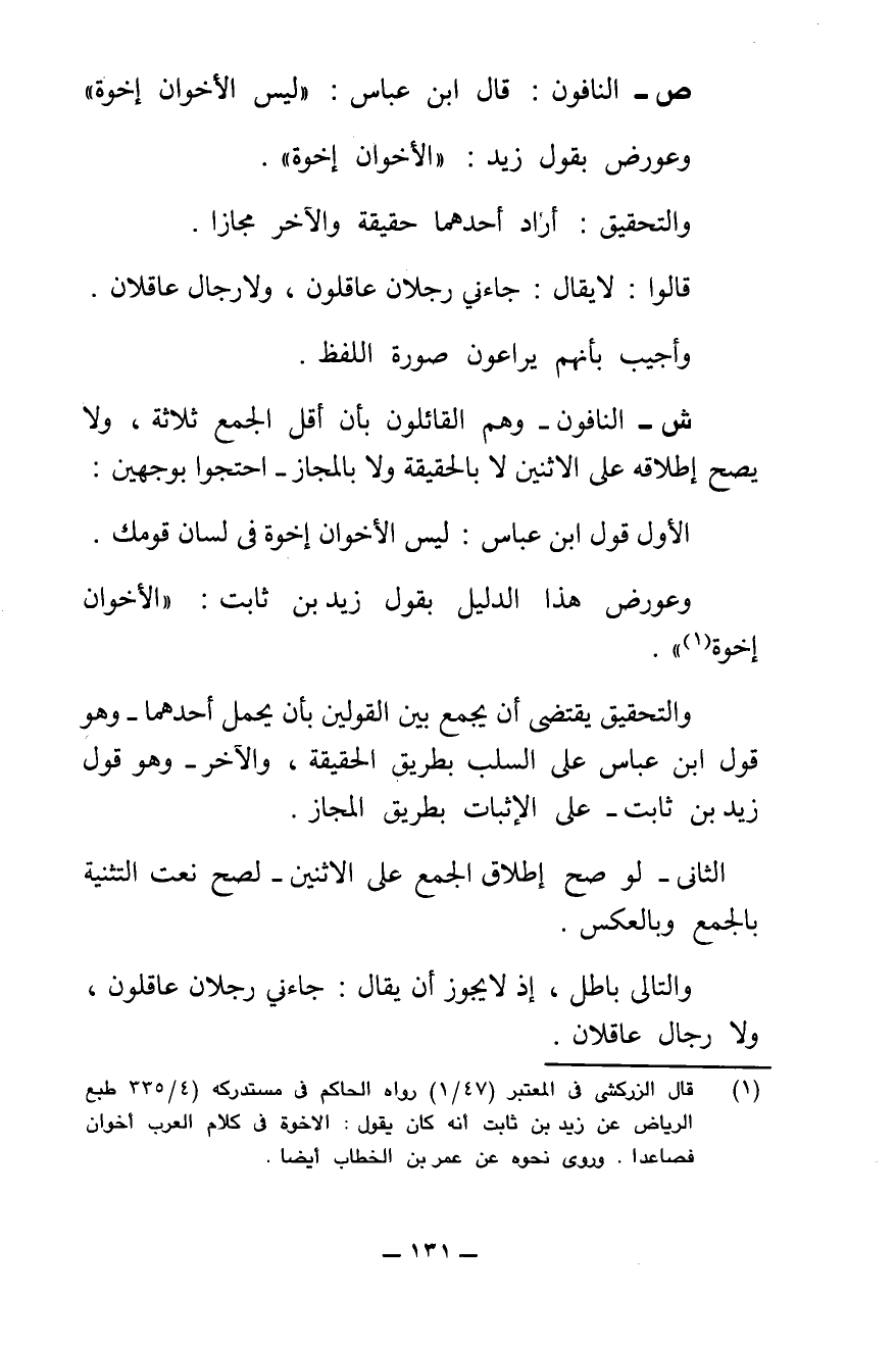 ص - النَّافُونَ: قَالَ ابْنُ عَبَّاسٍ: " لَيْسَ الْأَخَوَانِ إِخْوَةً " وَعُورِضَ بِقَوْلِ زَيْدٍ: " الْأَخَوَانِ إِخْوَةٌ ".