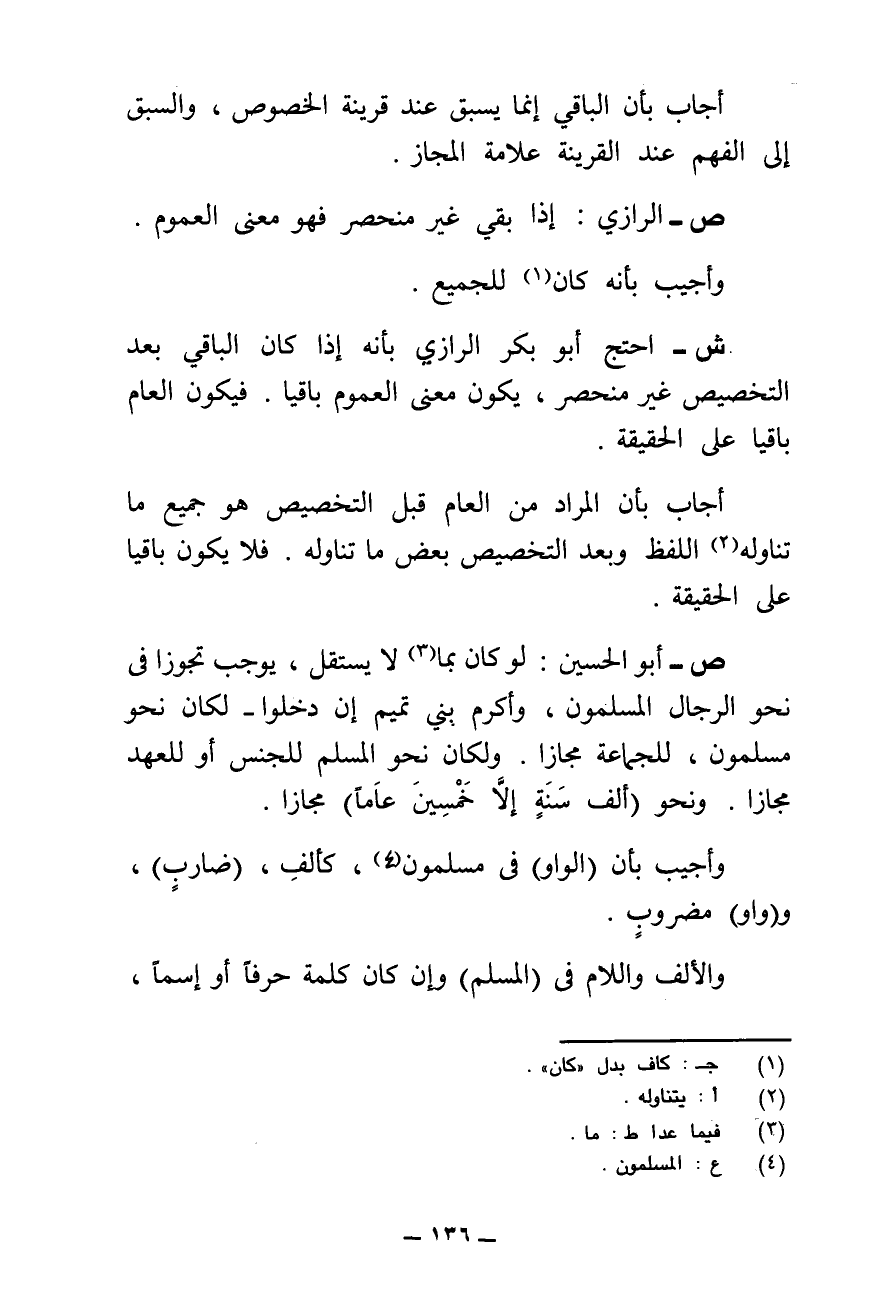 ش - احْتَجَّ أَبُو الْحُسَيْنِ بِأَنَّهُ لَوْ كَانَ (التَّخْصِيصُ) بِمَا لَا يَسْتَقِلُّ مِنَ (الْقَرَائِنِ الْمُخَصِّصَةِ، كَالشَّرْطِ وَالصِّفَةِ، وَالِاسْتِثْنَاءُ يُوجِبُ التَّجَوُّزَ فِي الْعَامِّ الَّذِي اخْتَصَّ بِتِلْكَ الْقَرَائِنِ) نَحْوَ (الرِّجِالُ) (الْمُسْلِمُونَ) وَأَكْرِمْ بَنِي تَمِيمٍ إِنْ دَخَلُوا - لَكَانَ نَحْوَ (مُسْلِمُونَ) لِلْجَمَاعَةِ مَجَازًا، وَلَكَانَ نَحْوَ الْمُسْلِمِ لِلْجِنْسِ أَوْ لِلْعَهْدِ مَجَازًا، وَلَكَانَ نَحْوَ أَلْفَ سَنَةٍ إِلَّا خَمْسِينَ عَامًا مَجَازًا، وَالتَّوَالِي بَاطِلَةٌ بِالِاتِّفَاقِ.