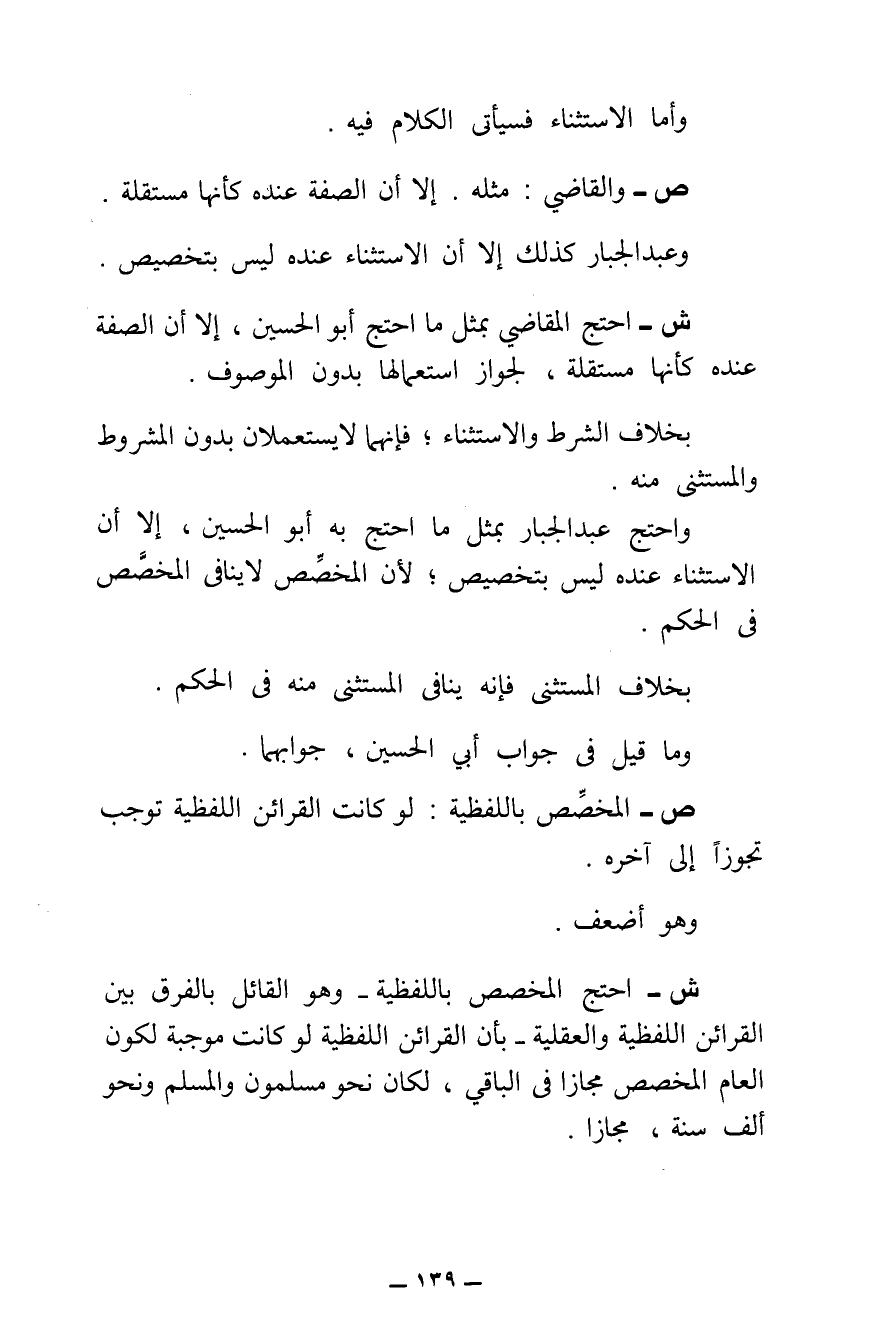 ش - احْتَجَّ الْقَاضِي بِمِثْلِ مَا احْتَجَّ أَبُو الْحُسَيْنِ، إِلَّا أَنَّ الصِّفَةَ عِنْدَهُ كَأَنَّهَا مُسْتَقِلَّةٌ، لِجَوَازِ اسْتِعْمَالِهَا بِدُونِ الْمَوْصُوفِ.