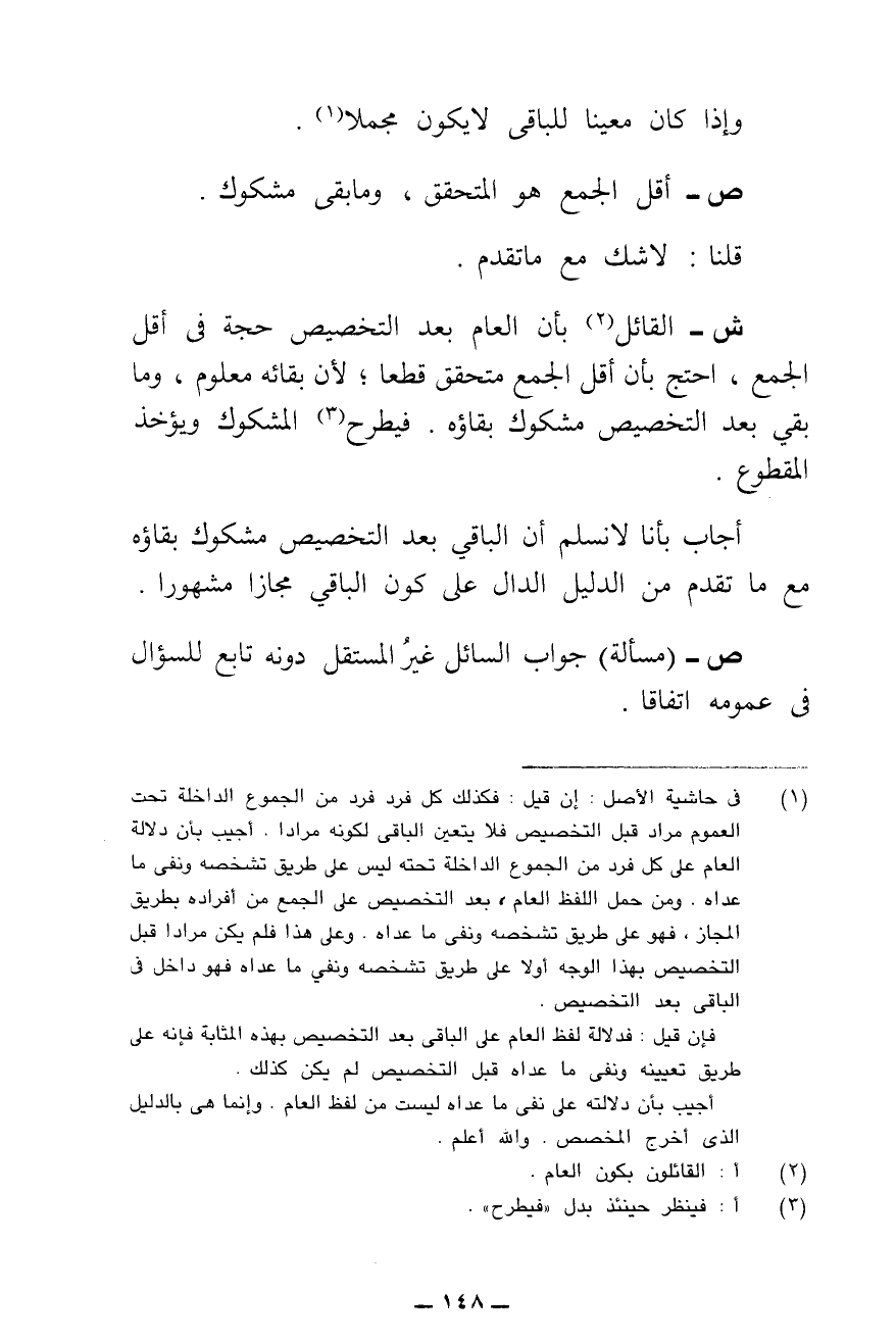 أَجَابَ بِأَنَّا لَا نُسَلِّمُ أَنَّ الْبَاقِيَ بَعْدَ التَّخْصِيصِ مَشْكُوكٌ بَقَاؤُهُ مَعَ مَا تَقَدَّمَ مِنَ الدَّلِيلِ الدَّالِّ عَلَى كَوْنِ الْبَاقِي مَجَازًا مَشْهُورًا.