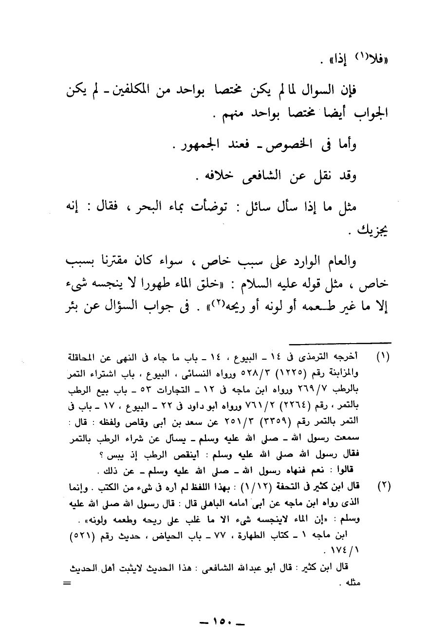وَالْعَامُّ الْوَارِدُ عَلَى سَبَبٍ خَاصٍّ، سَوَاءٌ كَانَ مُقْتَرِنًا بِسَبَبٍ خَاصٍّ، مِثْلَ قَوْلِهِ عَلَيْهِ السَّلَامُ: " «خُلِقَ الْمَاءَ طَهُورًا لَا يُنَجِّسُهُ شَيْءٌ إِلَّا مَا غَيَّرَ طَعْمَهُ أَوْ لَوْنَهُ أَوْ رِيحَهُ» ". فِي جَوَابِ السُّؤَالِ عَنْ بِئْرِ