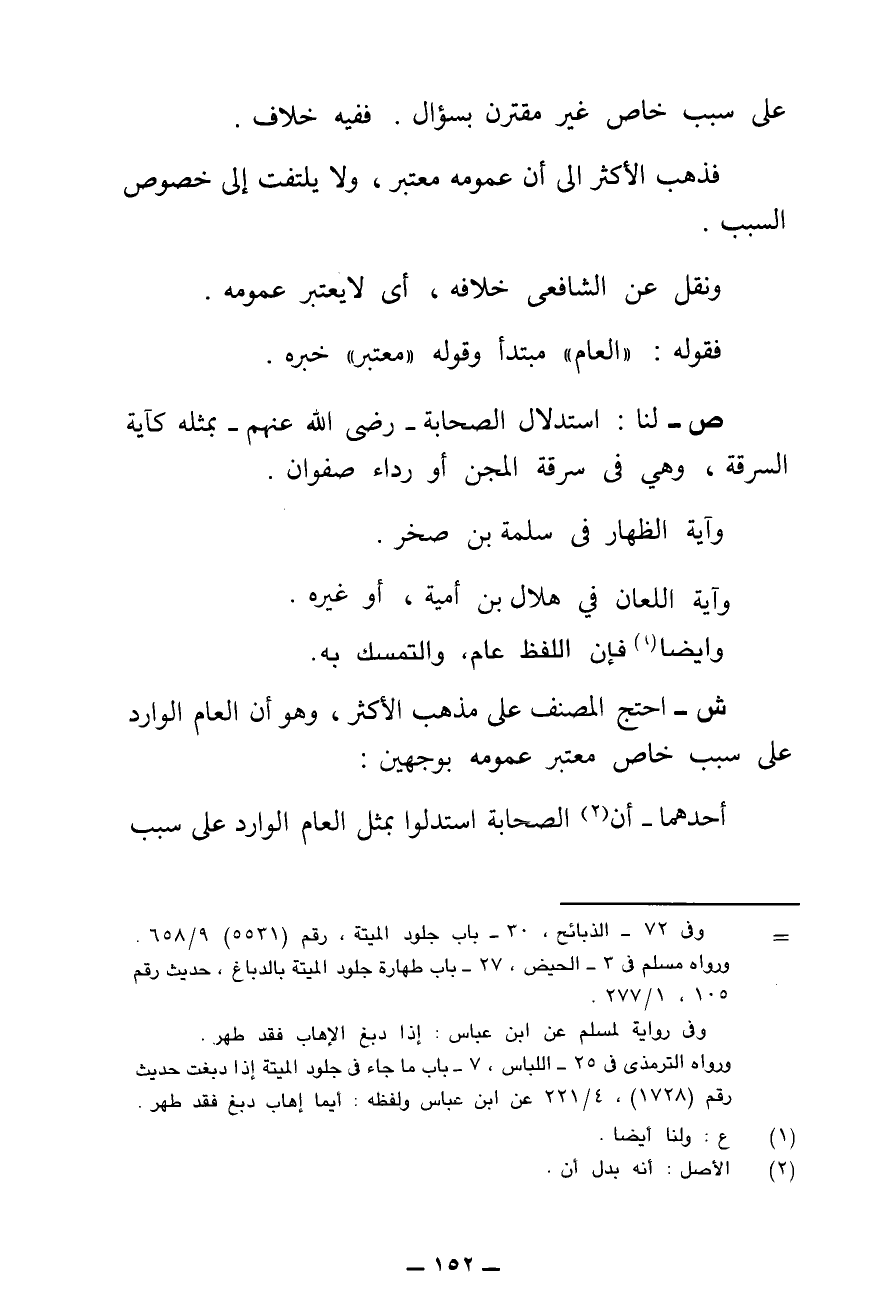 ش - احْتَجَّ الْمُصَنِّفُ عَلَى مَذْهَبِ الْأَكْثَرِ، وَهُوَ أَنَّ الْعَامَّ الْوَارِدَ عَلَى سَبَبٍ خَاصٍّ مُعْتَبَرٌ عُمُومُهُ بِوَجْهَيْنِ: