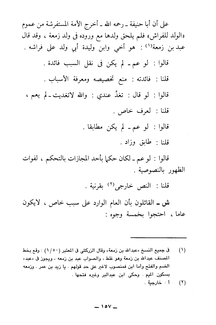 عَلَى أَنَّ أَبَا حَنِيفَةَ - رَحِمَهُ اللَّهُ - أَخْرَجَ الْأَمَةَ الْمُسْتَفْرَشَةَ مِنْ عُمُومِ " «الْوَلَدِ لِلْفِرَاشِ» " فَلَمْ يَلْحَقْ وَلَدُهَا مَعَ وُرُودِهِ فِي وَلَدِ زَمْعَةَ، وَقَدْ قَالَ عَبْدُ بْنُ زَمْعَةَ: هُوَ أَخِي وَابْنُ وَلِيدَةِ أَبِي؛ وُلِدَ عَلَى فِرَاشِهِ. قَالُوا: لَوْ عَمَّ - لَمْ يَكُنْ فِي نَقْلِ السَّبَبِ فَائِدَةٌ.