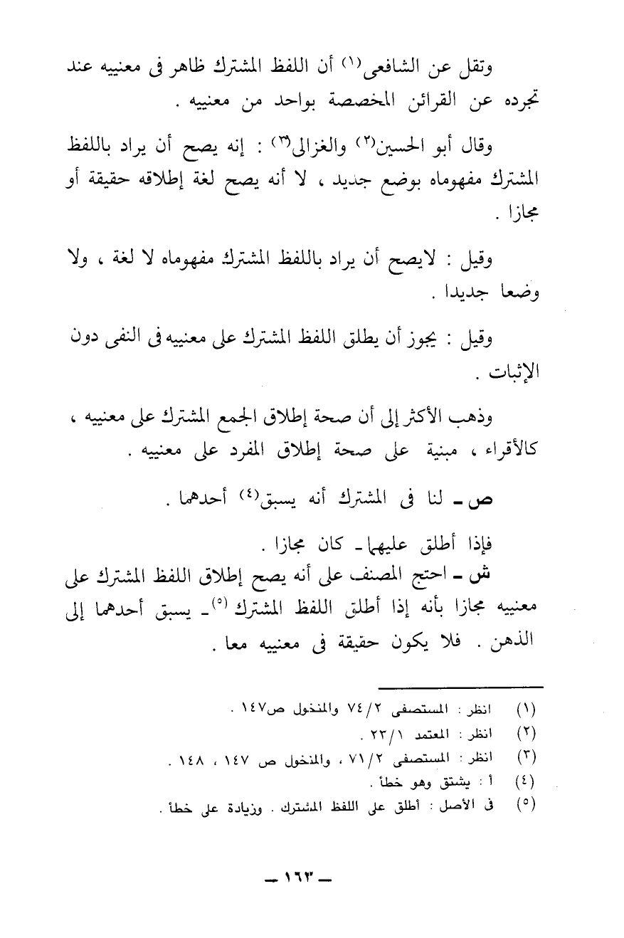 ش - احْتَجَّ الْمُصَنِّفُ عَلَى أَنَّهُ يَصِحُّ إِطْلَاقُ اللَّفْظِ الْمُشْتَرَكِ عَلَى مَعْنَيَيْهِ مَجَازًا بِأَنَّهُ إِذَا أُطْلِقَ اللَّفْظُ الْمُشْتَرَكُ يَسْبِقُ أَحَدُهُمَا إِلَى الذِّهْنِ. فَلَا يَكُونُ حَقِيقَةً فِي مَعْنَيَيْهِ مَعًا.
