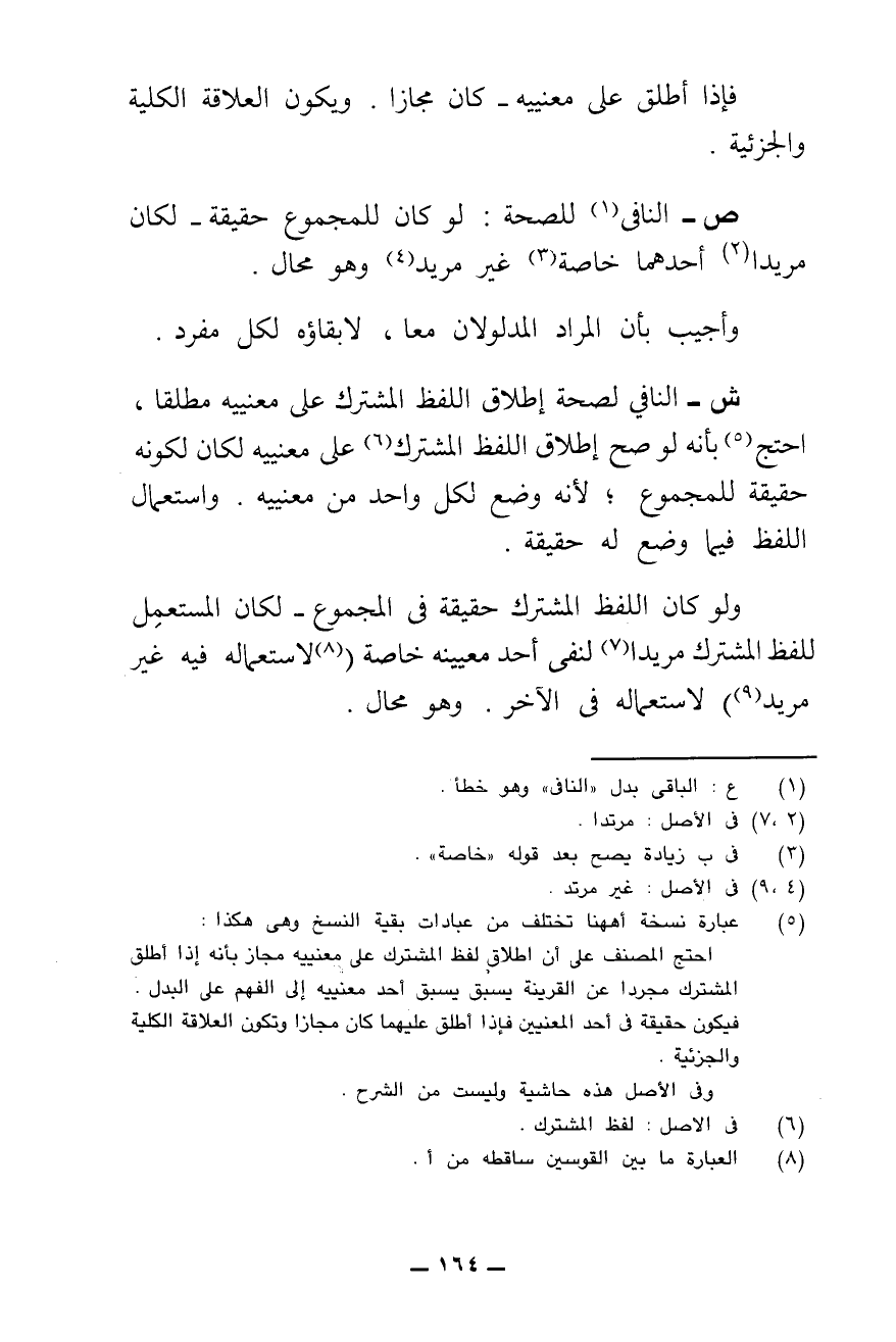 وَلَوْ كَانَ اللَّفْظُ الْمُشْتَرَكُ حَقِيقَةً فِي الْمَجْمُوعِ لَكَانَ الْمُسْتَعْمِلُ لِلَّفْظِ الْمُشْتَرَكِ مُرِيدًا لَنَفْيِ أَحَدِ مَعْنَيَيْهِ خَاصَّةً (لِاسْتِعْمَالِهِ فِيهِ غَيْرَ مُرِيدٍ) لِاسْتِعْمَالِهِ فِي الْآخَرِ. وَهُوَ مُحَالٌ.