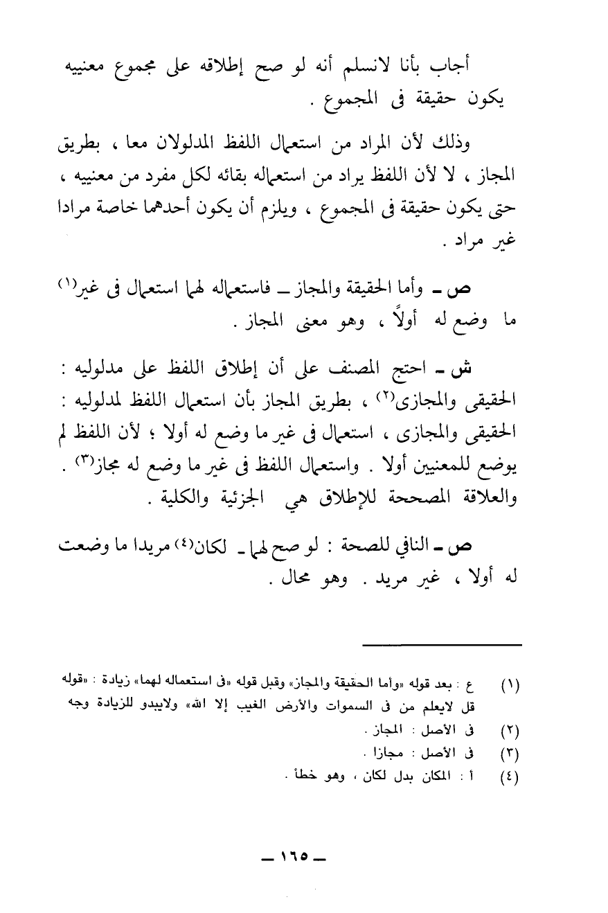 وَذَلِكَ لِأَنَّ الْمُرَادَ مِنَ اسْتِعْمَالِ اللَّفْظِ الْمَدْلُولَانِ مَعًا، بِطَرِيقِ الْمَجَازِ، لَا لِأَنَّ اللَّفْظَ يُرَادُ مِنَ اسْتِعْمَالِهِ بَقَاؤُهُ لِكُلِّ مُفْرَدٍ مِنْ مَعْنَيَيْهِ، حَتَّى يَكُونَ حَقِيقَةً فِي الْمَجْمُوعِ، وَيَلْزَمُ أَنْ يَكُونَ أَحَدُهُمَا خَاصَّةً مُرَادًا غَيْرَ مُرَادٍ.