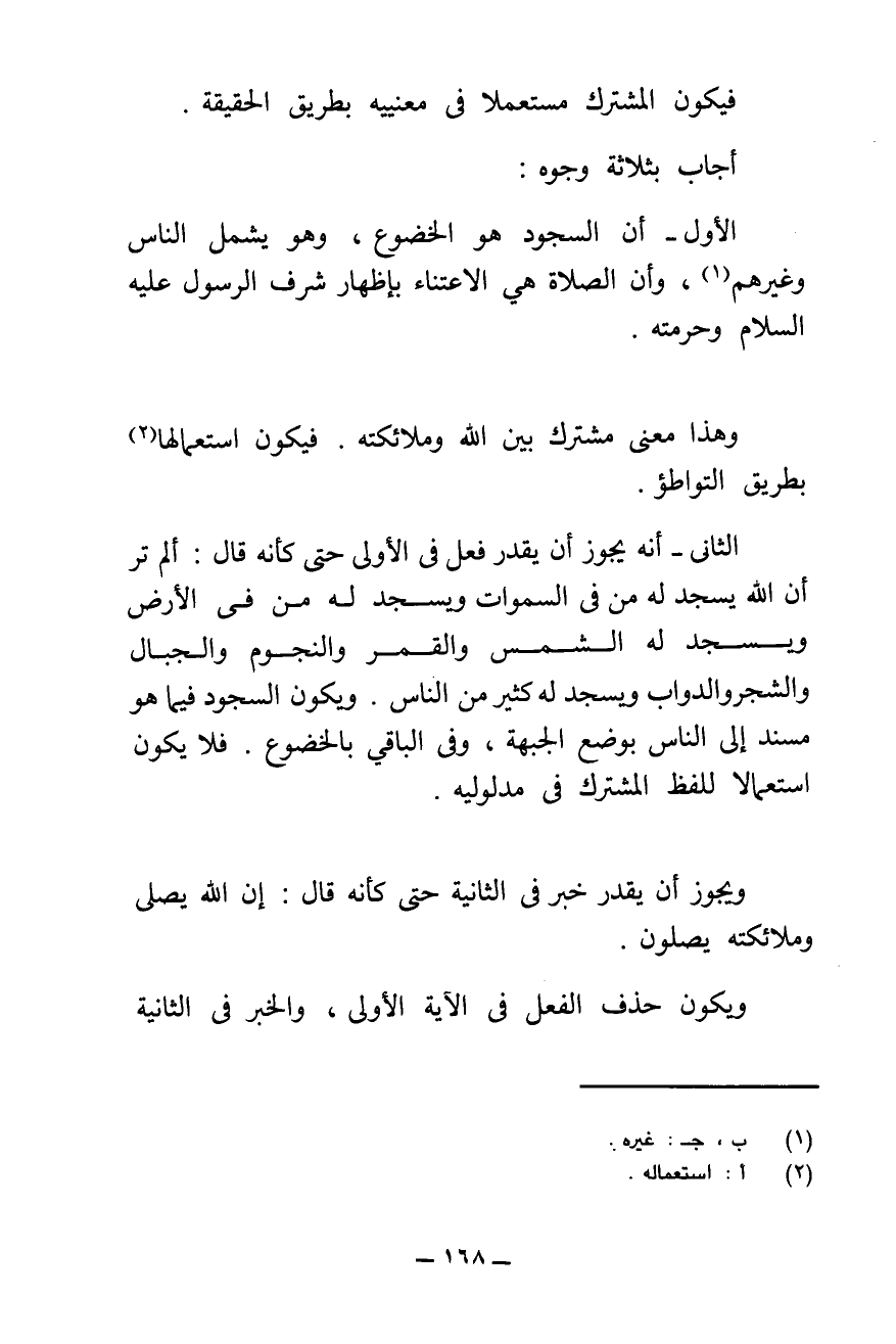 الثَّانِي: أَنَّهُ يَجُوزُ أَنْ يُقَدَّرَ فِعْلٌ فِي الْأُولَى حَتَّى كَأَنَّهُ قَالَ: أَلَمْ تَرَ أَنَّ اللَّهَ يَسْجُدُ لَهُ مَنْ فِي السَّمَاوَاتِ وَسَجَدَ لَهُ مَنْ فِي الْأَرْضِ وَيَسْجُدُ لَهُ الشَّمْسُ وَالْقَمَرُ وَالنُّجُومُ وَالْجِبَالُ وَالشَّجَرُ وَالدَّوَابُّ وَيَسْجُدُ لَهُ كَثِيرٌ مِنَ النَّاسِ. وَيَكُونُ السُّجُودُ فِيمَا هُوَ مُسْنَدٌ إِلَى النَّاسِ بِوَضْعِ الْجَبْهَةِ، وَفِي الْبَاقِي بِالْخُضُوعِ، فَلَا يَكُونُ اسْتِعْمَالًا لِلَّفْظِ الْمُشْتَرَكِ فِي مَدْلُولَيْهِ.