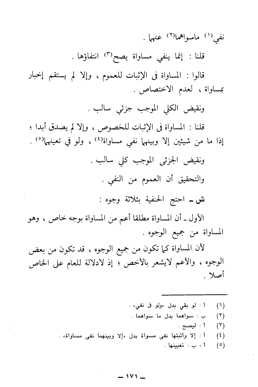 قُلْنَا: الْمُسَاوَاةُ فِي الْإِثْبَاتِ لِلْخُصُوصِ، وَإِلَّا لَمْ يَصْدُقْ أَبَدًا ; إِذْ مَا مِنْ شَيْئَيْنِ إِلَّا وَبَيْنَهُمَا نَفْيُ مُسَاوَاةٍ، وَلَوْ فِي تَعَيُّنِهِمَا. وَنَقِيضُ الْجُزْئِيِّ الْمُوجَبِ كُلِّيٌّ سَالِبٌ.