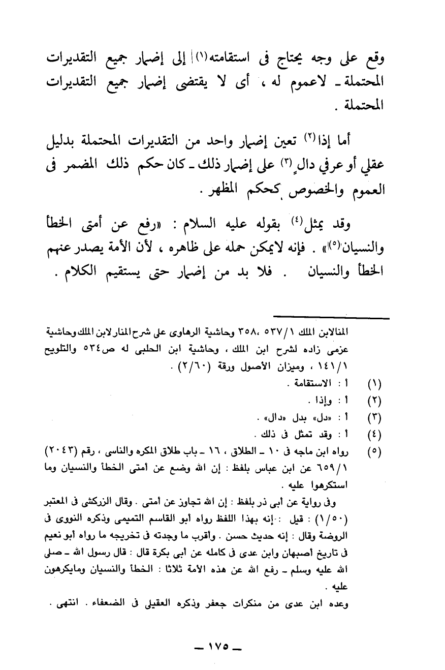 وَقَعَ عَلَى وَجْهٍ يُحْتَاجُ فِي اسْتِقَامَتِهِ إِلَى إِضْمَارِ جَمِيعِ التَّقْدِيرَاتِ الْمُحْتَمَلَةِ - لَا عُمُومَ لَهُ، أَيْ لَا يَقْتَضِي إِضْمَارَ جَمِيعِ التَّقْدِيرَاتِ الْمُحْتَمَلَةِ.