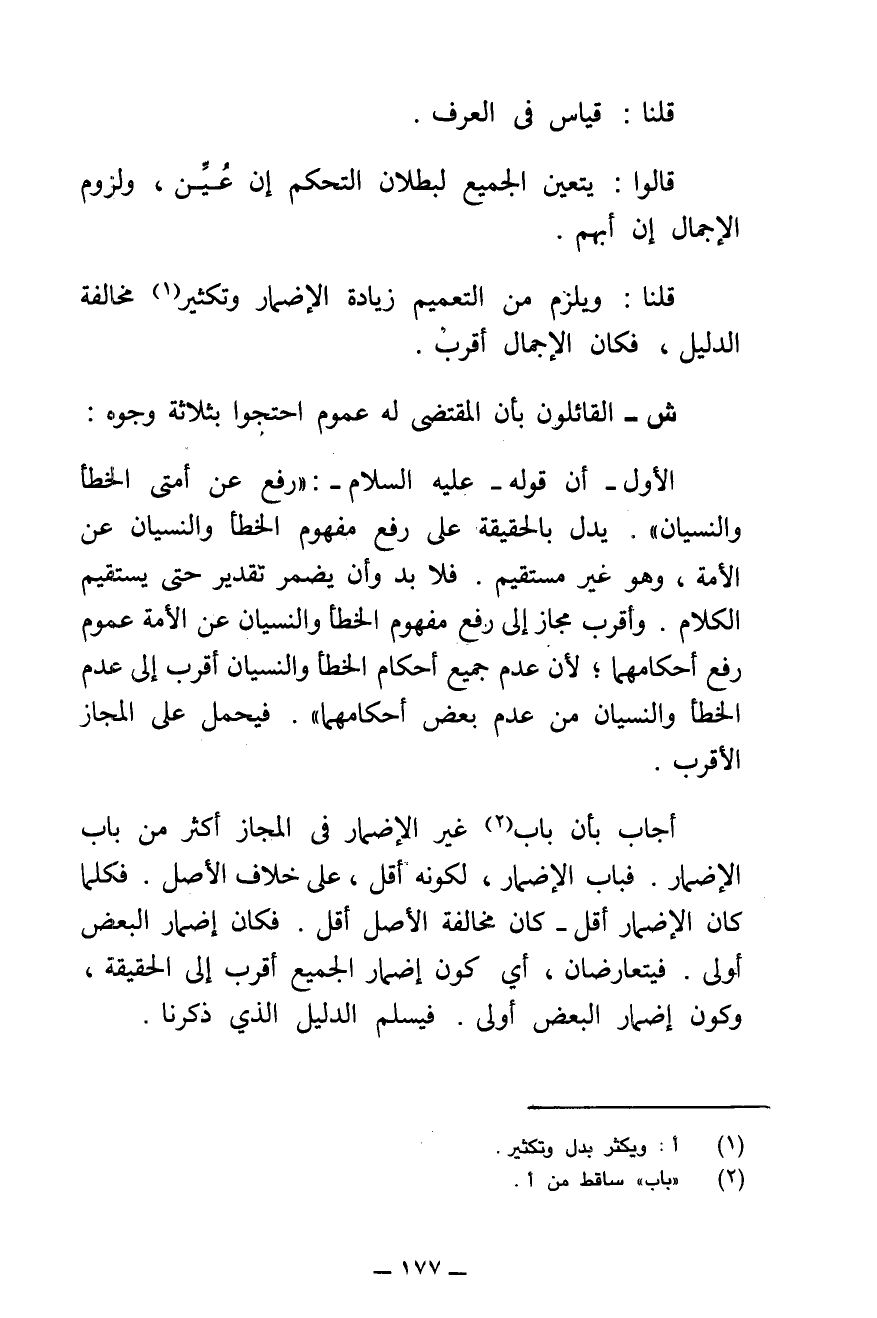 قُلْنَا: وَيَلْزَمُ مِنَ التَّعْمِيمِ زِيَادَةُ الْإِضْمَارِ وَتَكْثِيرُ مُخَالَفَةِ الدَّلِيلِ، فَكَانَ الْإِجْمَالُ أَقْرَبَ.