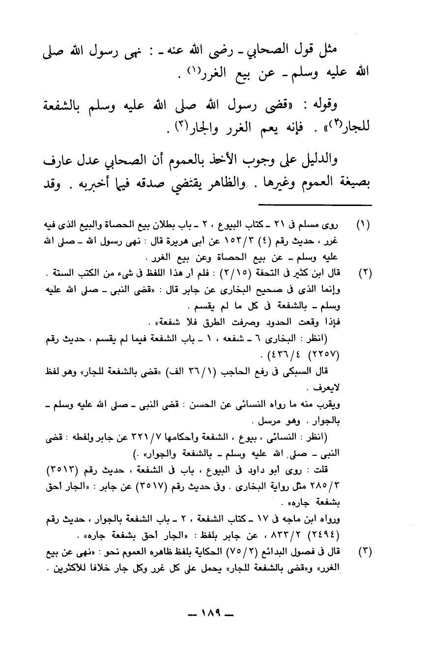 وَقَوْلِهِ: " «قَضَى رَسُولُ اللَّهِ صَلَّى اللَّهُ عَلَيْهِ وَسَلَّمَ بِالشُّفْعَةِ لِلْجَارِ» ". فَإِنَّهُ يَعُمُّ الْغَرَرَ وَالْجَارَ.