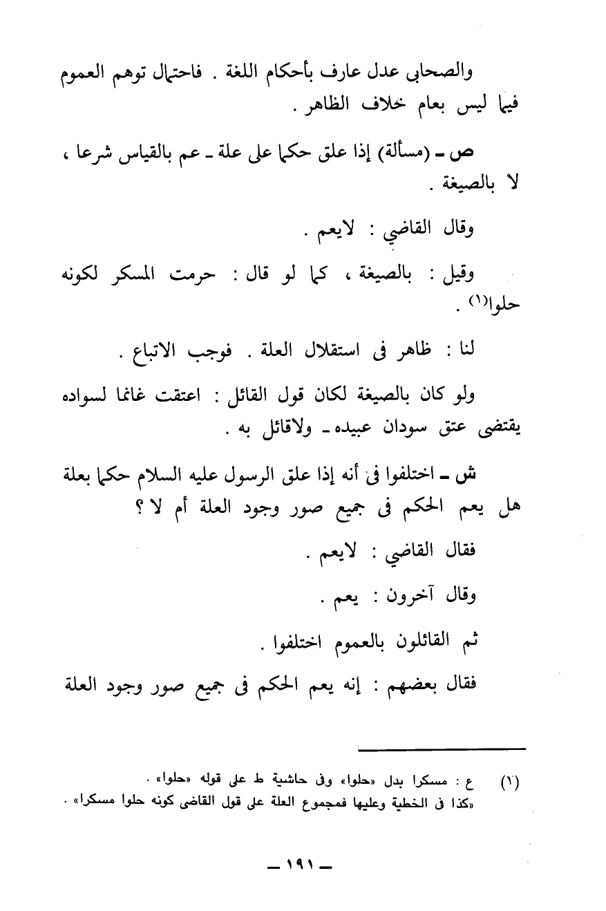 ش - اخْتَلَفُوا فِي أَنَّهُ إِذَا عَلَّقَ الرَّسُولُ عَلَيْهِ السَّلَامُ حُكْمًا بِعِلَّةٍ هَلْ يَعُمُّ الْحُكْمُ فِي جَمِيعِ صُوَرِ وُجُودِ الْعِلَّةِ أَمْ لَا؟ فَقَالَ الْقَاضِي: لَا يَعُمُّ.