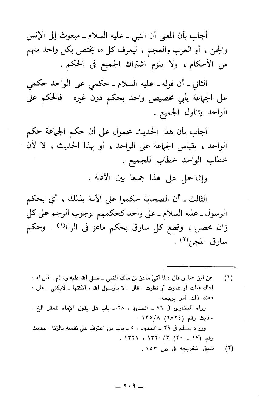الثَّانِي - أَنَّ قَوْلَهُ - عَلَيْهِ السَّلَامُ - «حُكْمِي عَلَى الْوَاحِدِ حُكْمِي عَلَى الْجَمَاعَةِ» يَأْبَى تَخْصِيصَ وَاحِدٍ بِحُكْمٍ دُونَ غَيْرِهِ. فَالْحُكْمُ عَلَى الْوَاحِدِ يَتَنَاوَلُ الْجَمِيعَ.
