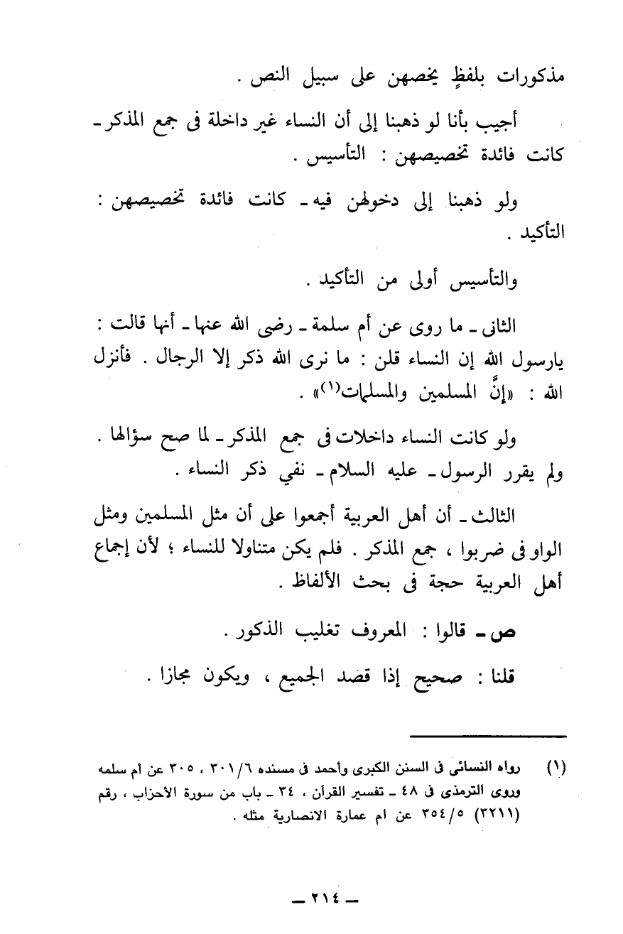 وَلَمْ يُقَرِّرِ الرَّسُولُ - عَلَيْهِ السَّلَامُ - نَفْيَ ذِكْرِ النِّسَاءِ.
