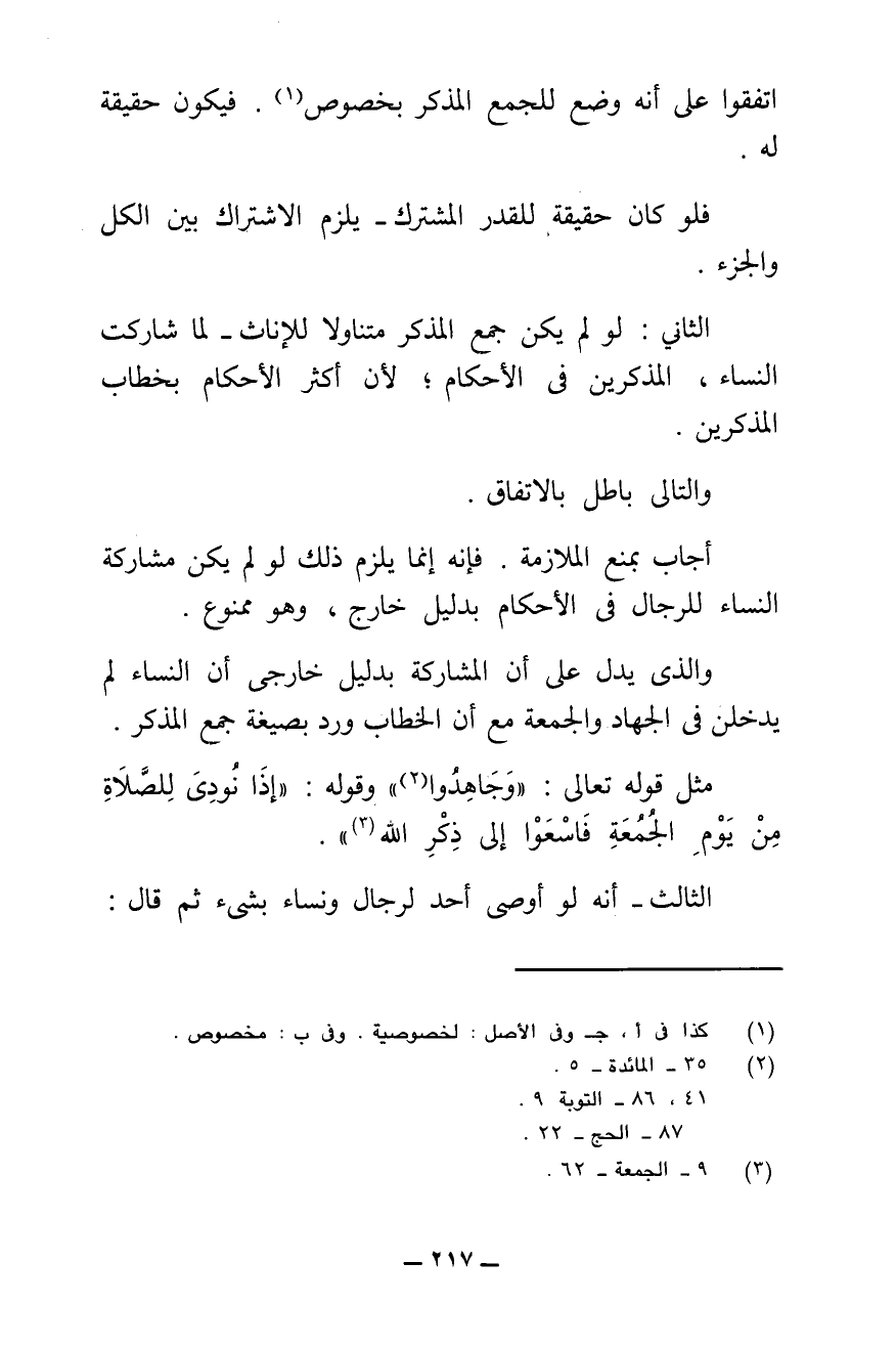 وَالَّذِي يَدُلُّ عَلَى أَنَّ الْمُشَارَكَةَ بِدَلِيلٍ خَارِجِيٍّ أَنَّ النِّسَاءَ لَمْ يَدْخُلْنَ فِي الْجِهَادِ وَالْجُمُعَةِ مَعَ أَنَّ الْخِطَابَ وَرَدَ بِصِيغَةِ جَمْعِ الْمُذَكَّرِ.