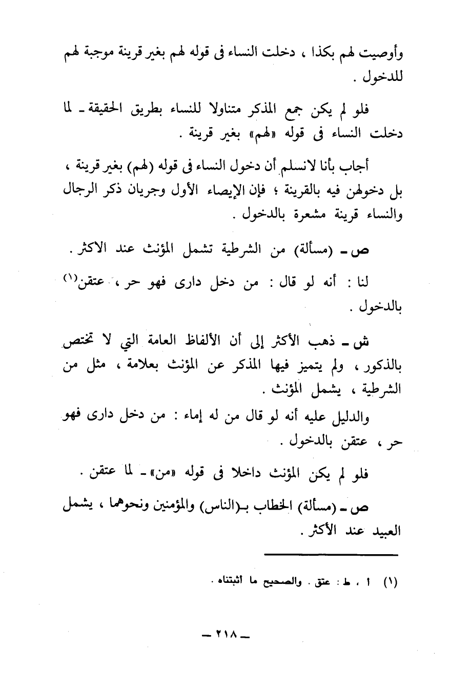 ش - ذَهَبَ الْأَكْثَرُ إِلَى أَنَّ الْأَلْفَاظَ الْعَامَّةَ الَّتِي لَا تَخْتَصُّ بِالذُّكُورِ، وَلَمْ يَتَمَيَّزْ فِيهَا الْمُذَكَّرُ عَنِ الْمُؤَنَّثِ بِعَلَامَةٍ مِثْلَ مَنِ الشَّرْطِيَّةِ، يَشْمَلُ الْمُؤَنَّثَ.