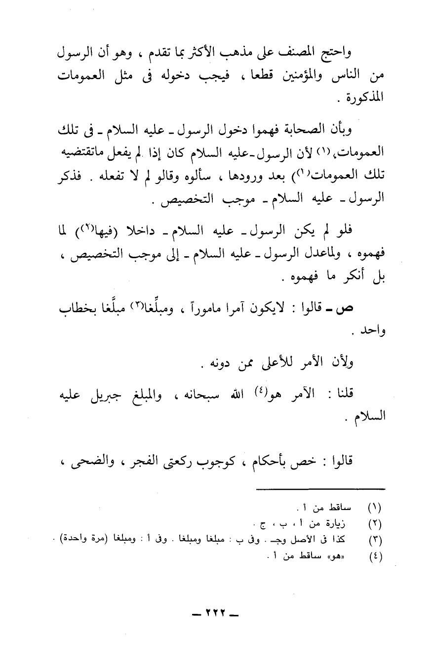 وَبِأَنَّ الصَّحَابَةَ فَهِمُوا دُخُولَ الرَّسُولِ - عَلَيْهِ السَّلَامُ - فِي تِلْكَ الْعُمُومَاتِ، لِأَنَّ الرَّسُولَ - عَلَيْهِ السَّلَامُ - كَانَ إِذَا لَمْ يَفْعَلْ مَا تَقْتَضِيهِ تِلْكَ الْعُمُومَاتُ بَعْدَ وُرُودِهَا. سَأَلُوهُ وَقَالُوا لِمَ لَا تَفْعَلُهُ، فَذَكَرَ الرَّسُولُ - عَلَيْهِ السَّلَامُ - مُوجِبَ التَّخْصِيصِ.