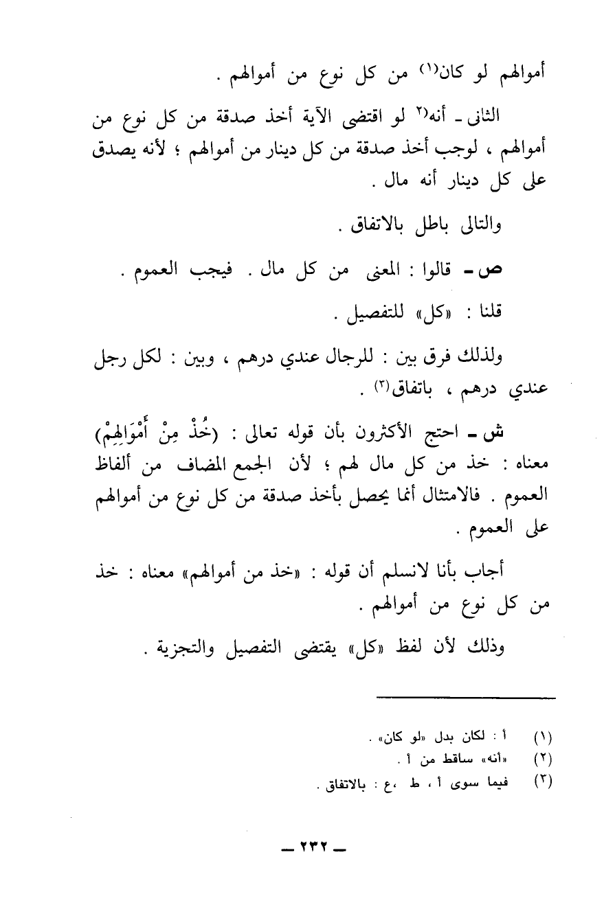 ش - احْتَجَّ الْأَكْثَرُونَ بِأَنَّ قَوْلَهُ تَعَالَى: {خُذْ مِنْ أَمْوَالِهِمْ} [التوبة: ١٠٣] مَعْنَاهُ: خُذْ مِنْ كُلِّ مَالٍ لَهُمْ ; لِأَنَّ الْجَمْعَ الْمُضَافَ مِنْ أَلْفَاظِ الْعُمُومِ. فَالِامْتِثَالُ إِنَّمَا يَحْصُلُ بِأَخْذِ صَدَقَةٍ مِنْ كُلِّ نَوْعٍ مِنْ أَمْوَالِهِمْ عَلَى الْعُمُومِ.